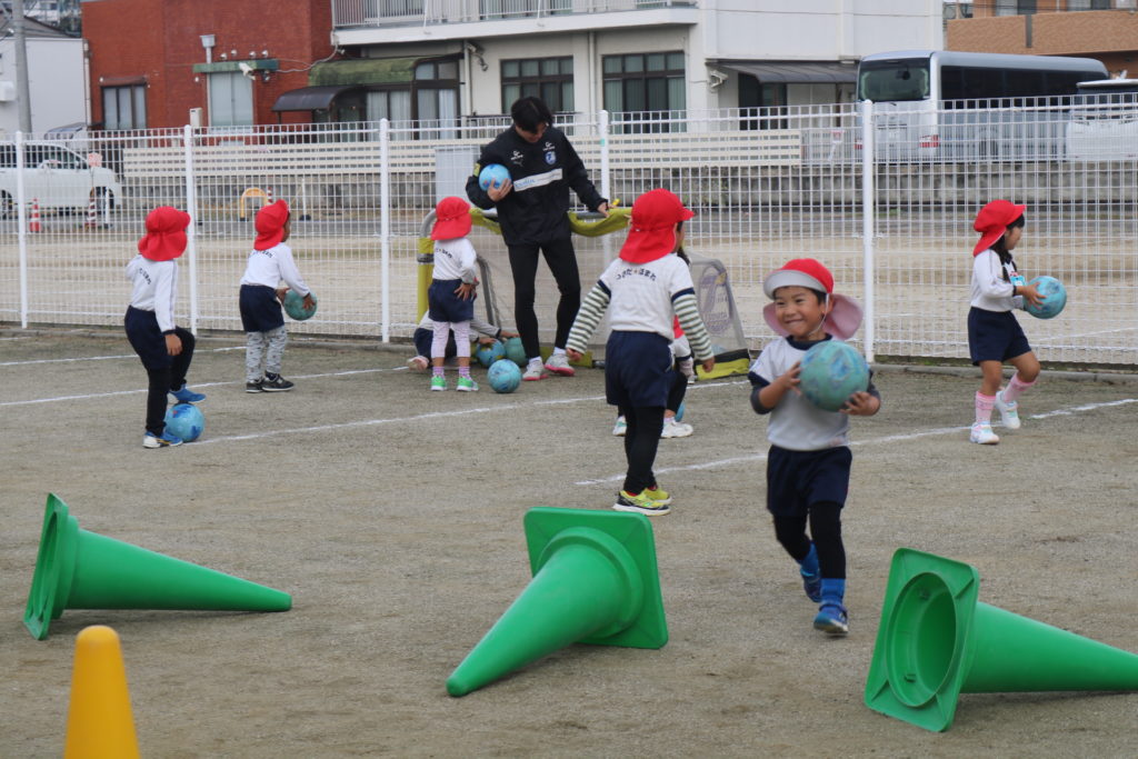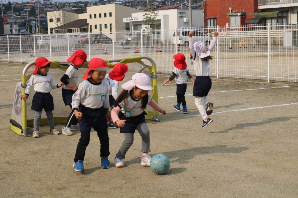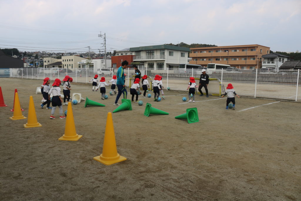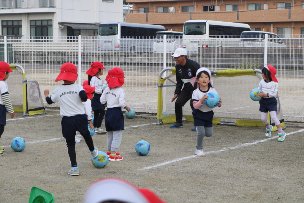 年中さん、年長さんでキッズサッカーがありました!体を動かすこと、ボールに触れる事、様々な動きをしながらも楽しむ事が出来ており、サッカーやボールを蹴る事の楽しさ、運動の楽しさを十分に感じることが出来ていました。昔にくらべ、体を動かして遊ぶ時間が減ってきている、子ども達です。園での外遊び、こういっった活動で多種多様の動きをする事は、こども達にとって大切な事だと感じています。と同時に、地域に根付くプロチームを応援したり、興味・関心をいだく事でスポーツの振興に繋がったり地域活性の手助けになるのではないかと思います。これからも地元のチームを応援しながらもキッズサッカーを楽しんでいきたいと思います。