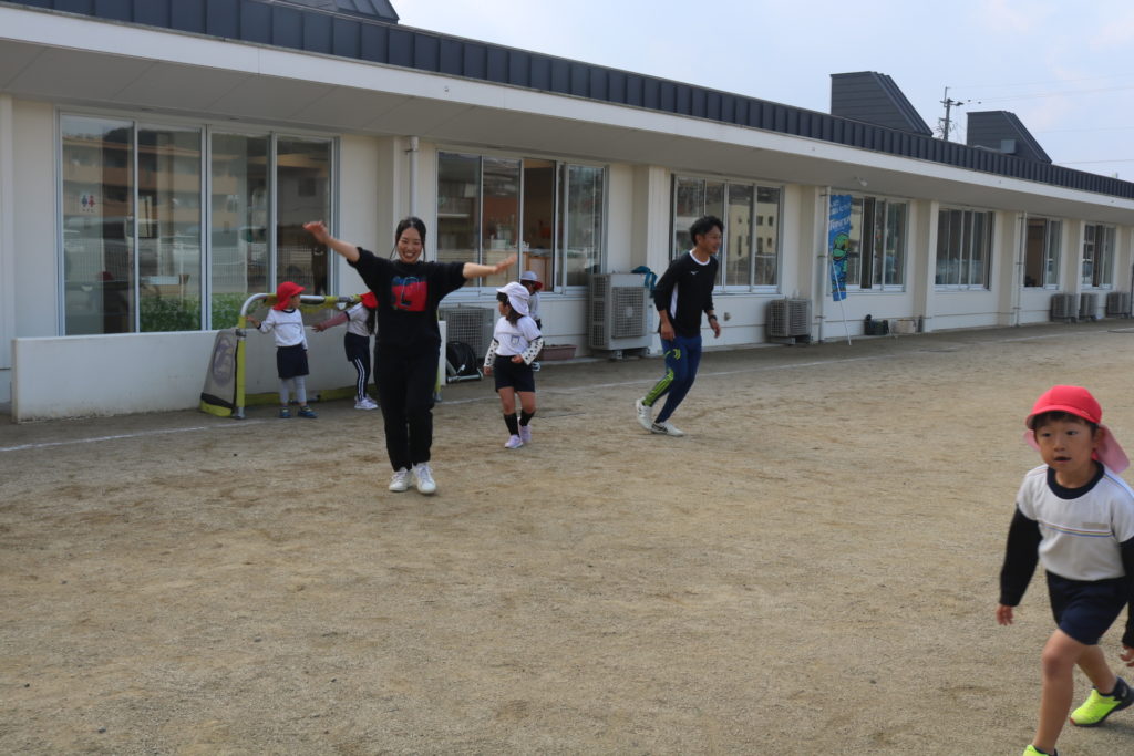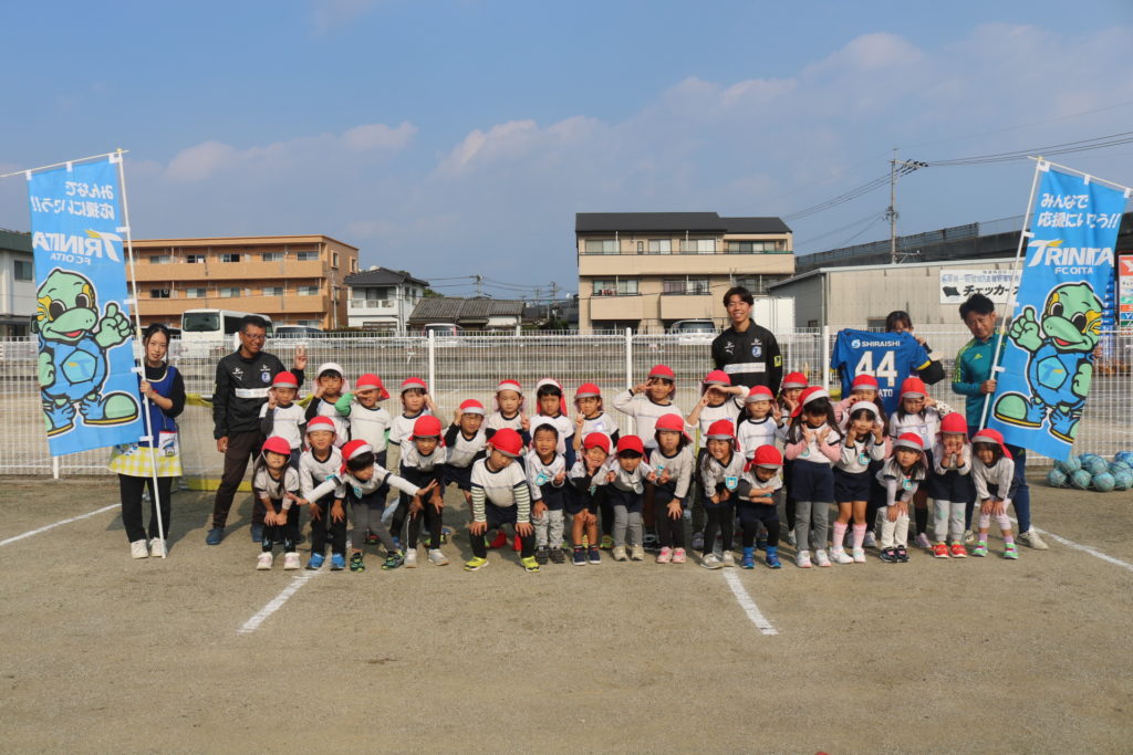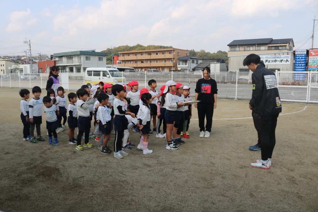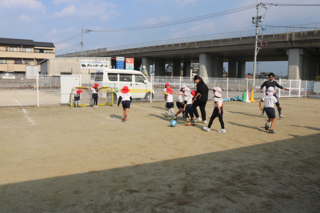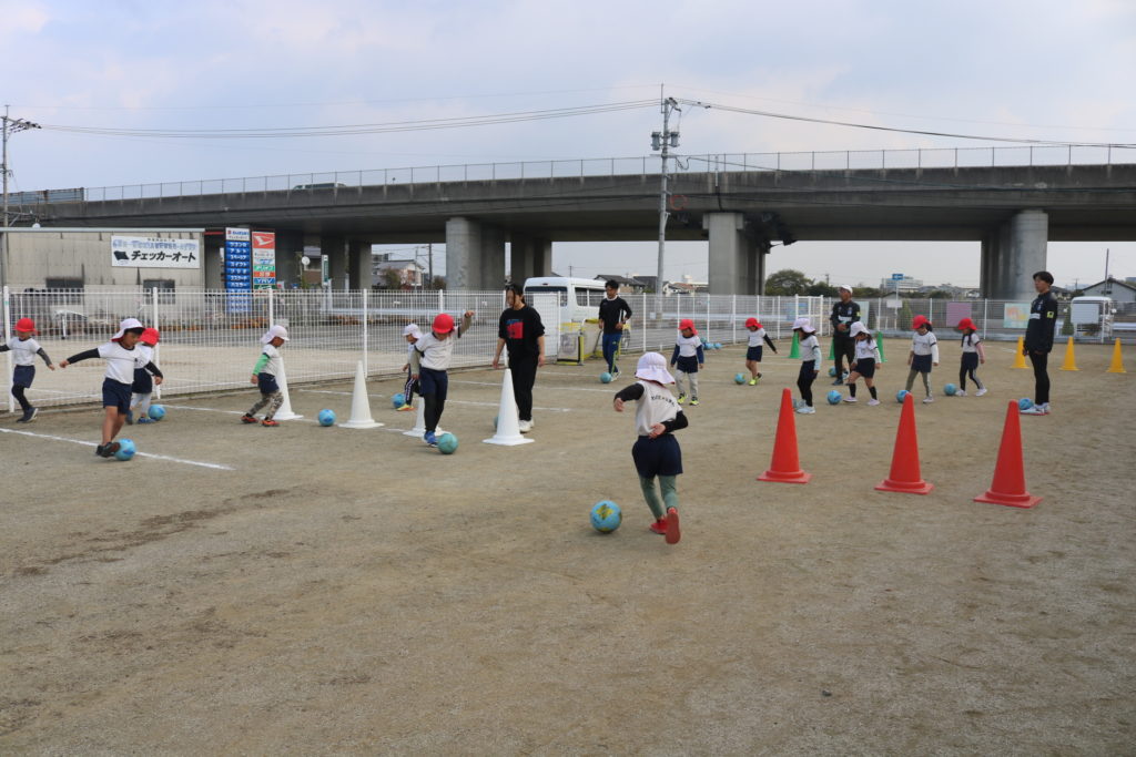 年中さん、年長さんでキッズサッカーがありました!体を動かすこと、ボールに触れる事、様々な動きをしながらも楽しむ事が出来ており、サッカーやボールを蹴る事の楽しさ、運動の楽しさを十分に感じることが出来ていました。昔にくらべ、体を動かして遊ぶ時間が減ってきている、子ども達です。園での外遊び、こういっった活動で多種多様の動きをする事は、こども達にとって大切な事だと感じています。と同時に、地域に根付くプロチームを応援したり、興味・関心をいだく事でスポーツの振興に繋がったり地域活性の手助けになるのではないかと思います。これからも地元のチームを応援しながらもキッズサッカーを楽しんでいきたいと思います。