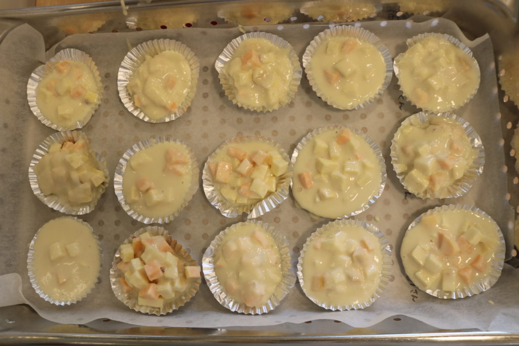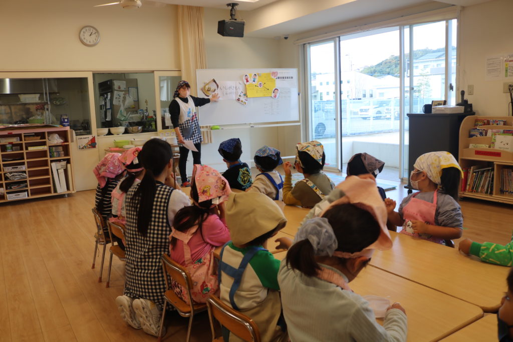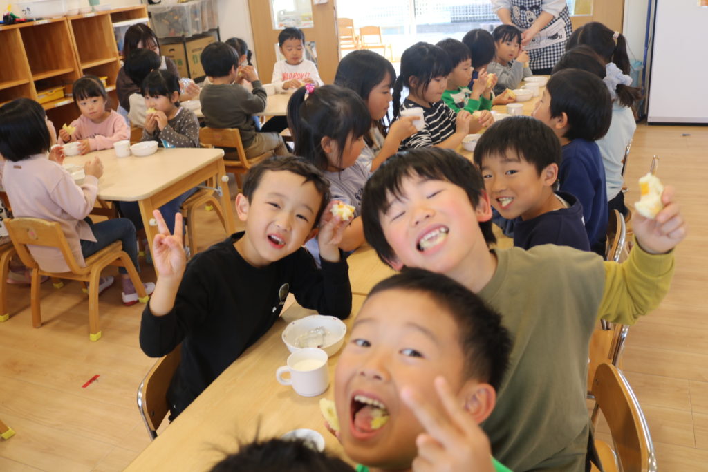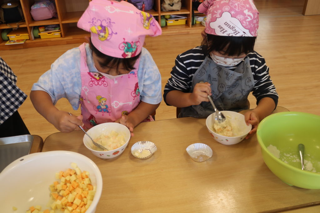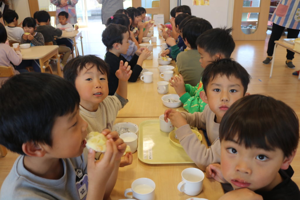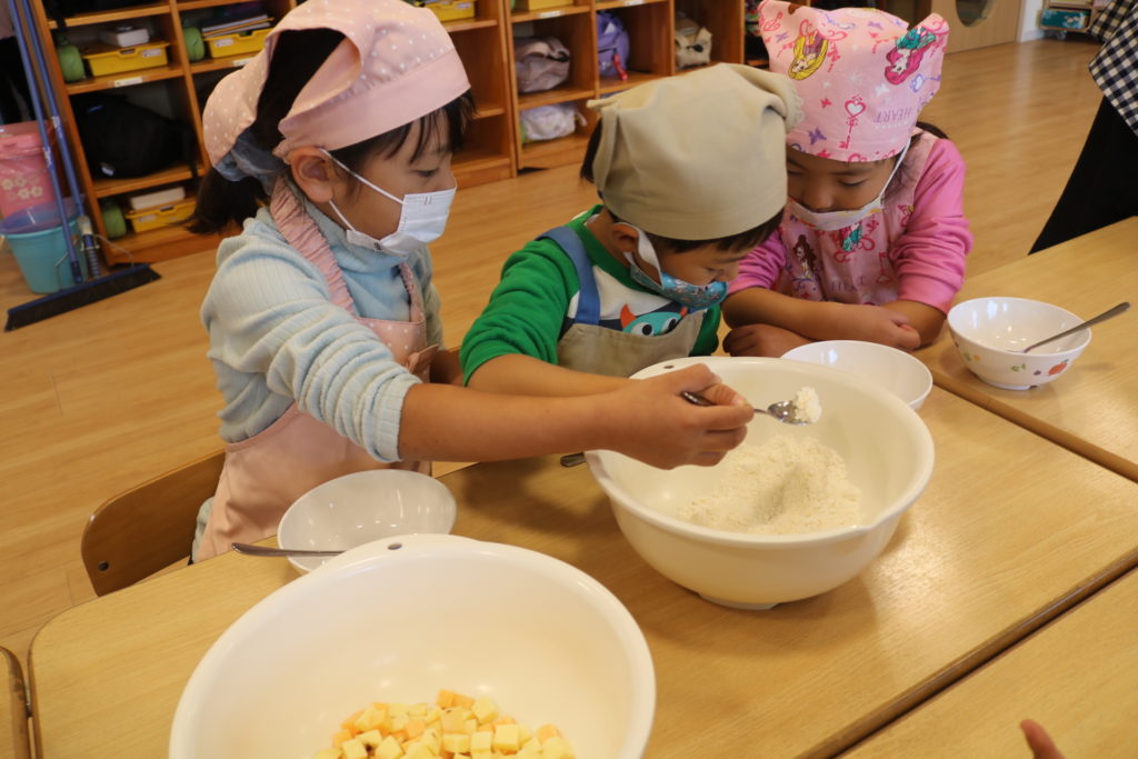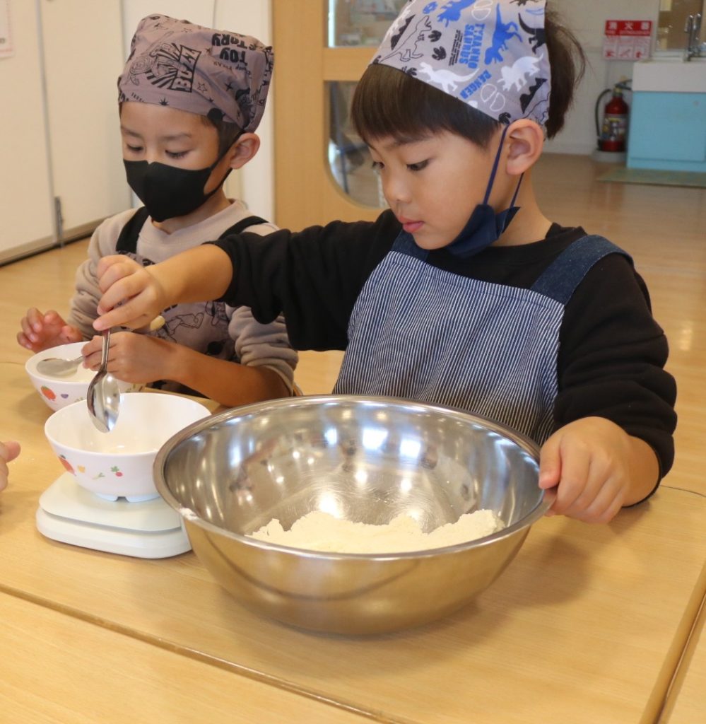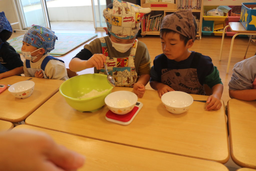 年長さんが、園で採れたサツマイモを使い、いしがきもちを作りました。給食の先生より、作り方を習いながら一緒に作って行きました。自分達で量りを見ながら、慎重に小麦粉の量を調節!そして、砂糖、塩、ベーキングパウダーも入れ、後は水を入れよくかき混ぜていきました。出来上がりを楽しみに待っている子ども達でした!出来上がった、いしがきもちを早速、皆で「いただきます」をしました。自分達で作った、いしがきもちは最高に美味しかったみたいで、笑顔が沢山溢れて食べていました。