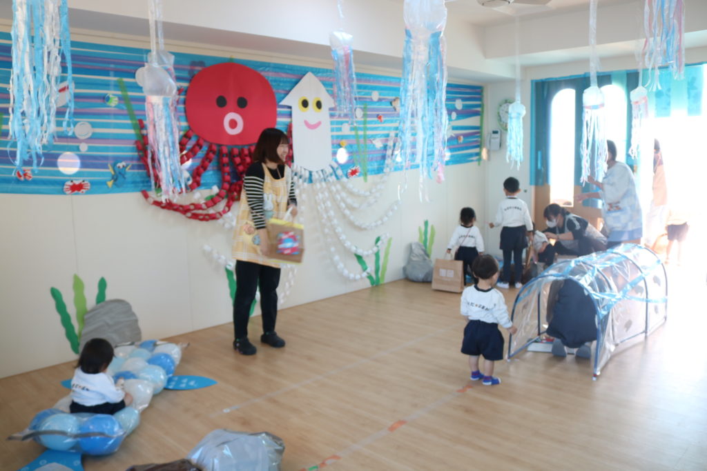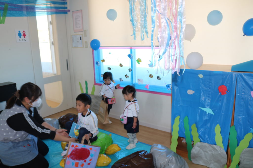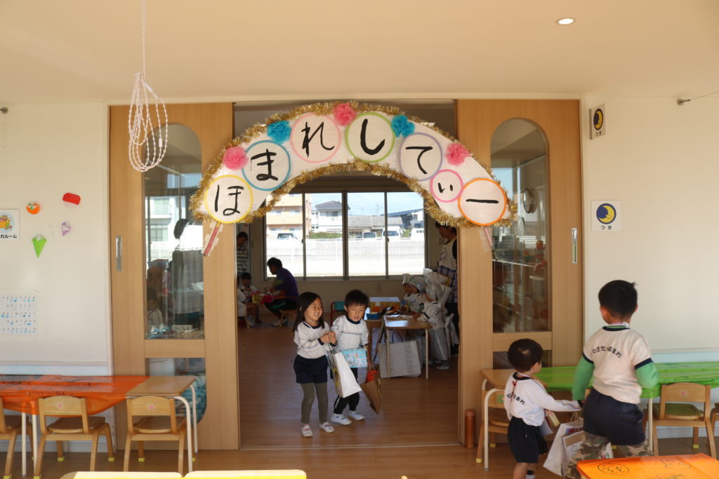 ほまれシティーというテーマで、お店屋さんごっこを行いました。ほまれの町には、どんなお店があるといい?っと、子ども達と、そんな事を考えながら、お店屋さんを選び病院や映画館、水族館におせんべい屋さんにパン屋さん、銀行、ピザ屋さんなど、沢山のお店が建ち並びました。お兄ちゃんお姉ちゃんに優しく手をひかれてお買い物をする未満児さんの可愛い姿、以上児さんの頼もしい姿、そんなお互いの可愛姿が見られていました。ほまれシティでは、元気の良い声が飛び交い、明るくて活気のある楽しい、ほまれシティ、お店屋さんごっこでした。