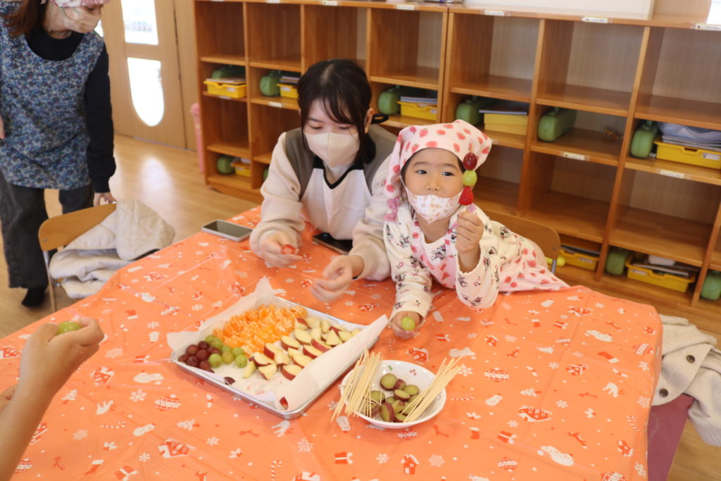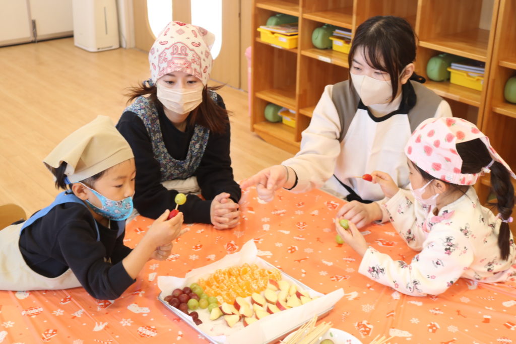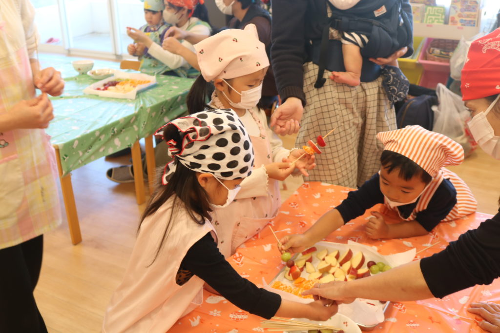 好きな果物を竹串に刺すよ!指に竹串が刺さらないように気を付けて!