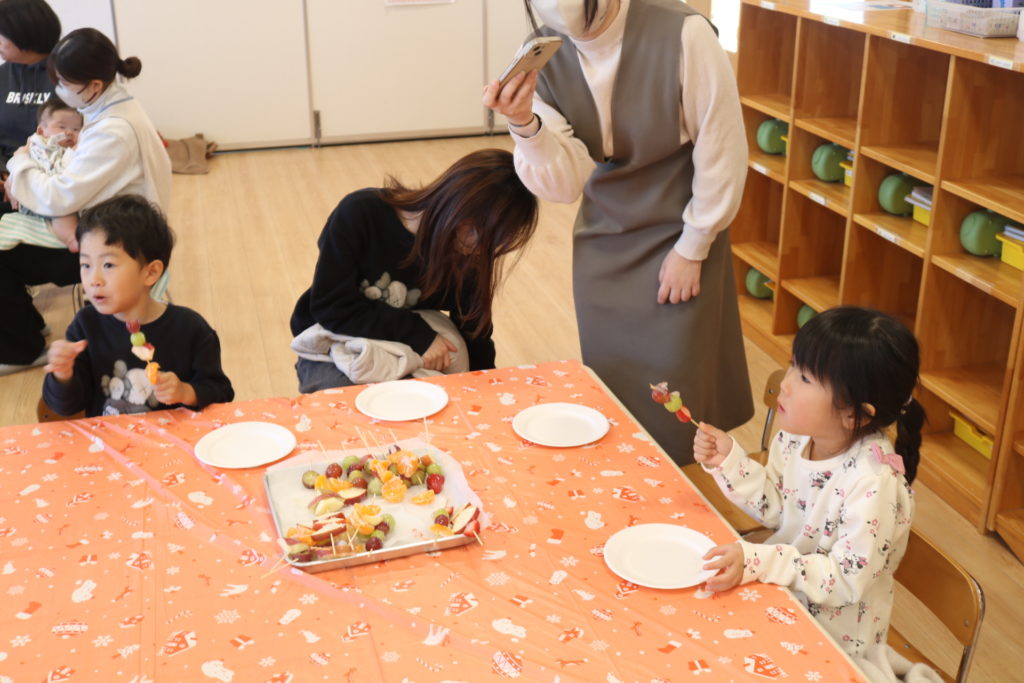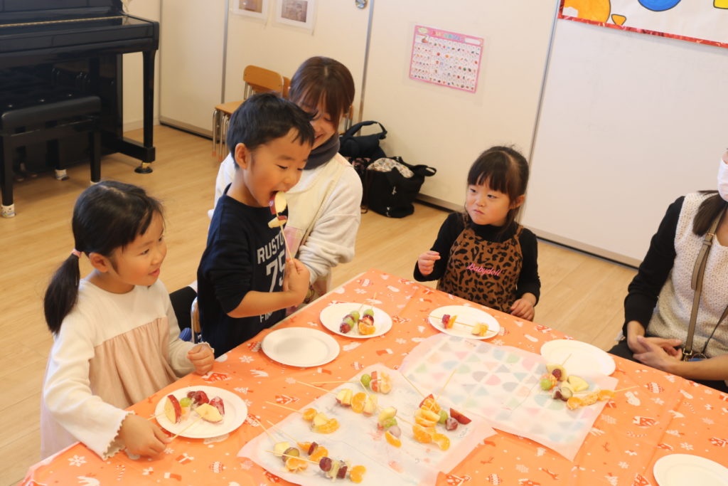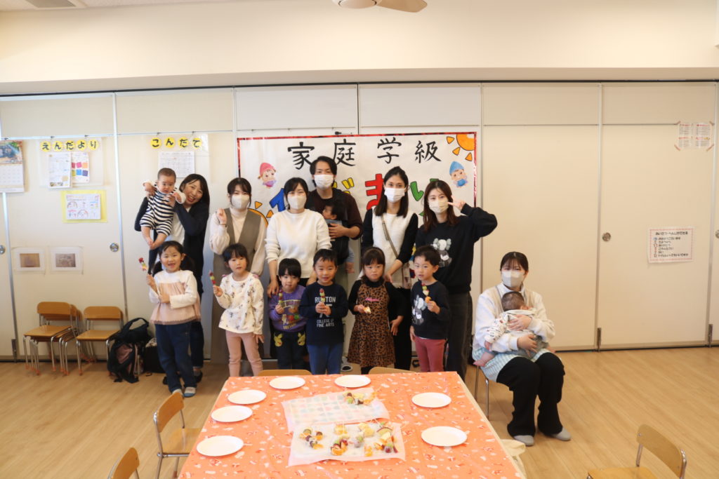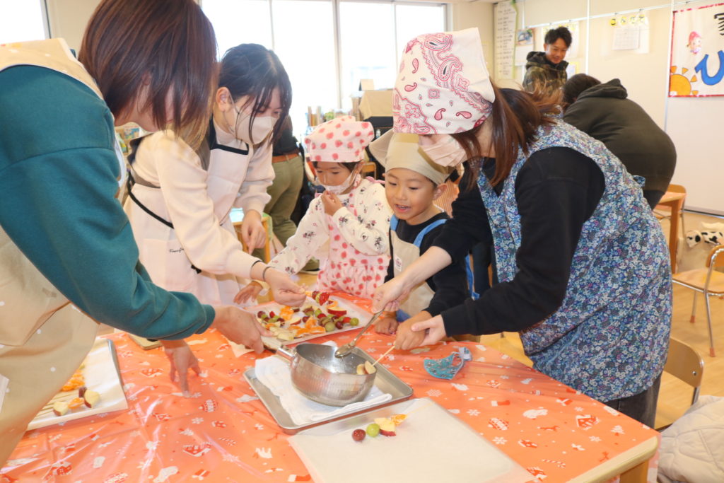 今回のひだまり学級では、親子でフルーツ飴作りを行いました。りんご、ぶどう、みかん、マスカット、いちご、彩りがとてもキレイで、それを親子で好きなように、竹串に刺していき、給食の先生が溶かしてくれた砂糖を絡めていきました、ここからは時間との勝負です。素早く、砂糖飴を果物に絡めていかないと、すぐに固まってしまします。そして、お父さんとお母さんと一緒に素早く砂糖飴を絡めてコーティング!コーティングすると、キレイな果物達がさらにキレイに輝き、とても美味しそうに輝いていました!親子の会話も弾み、簡単に出来るのでお家でも、また是非、作って楽しんで見て下さい。