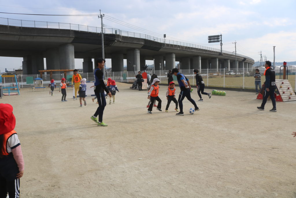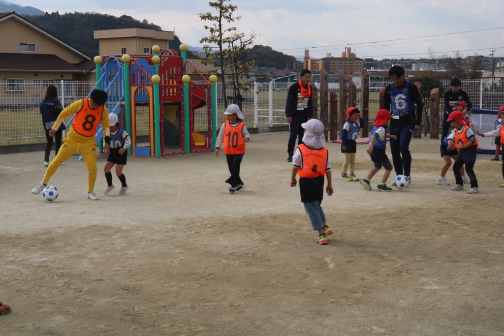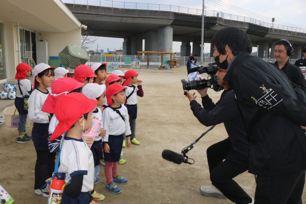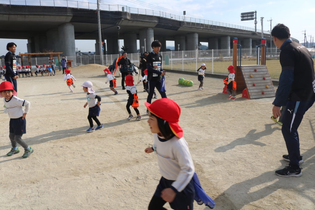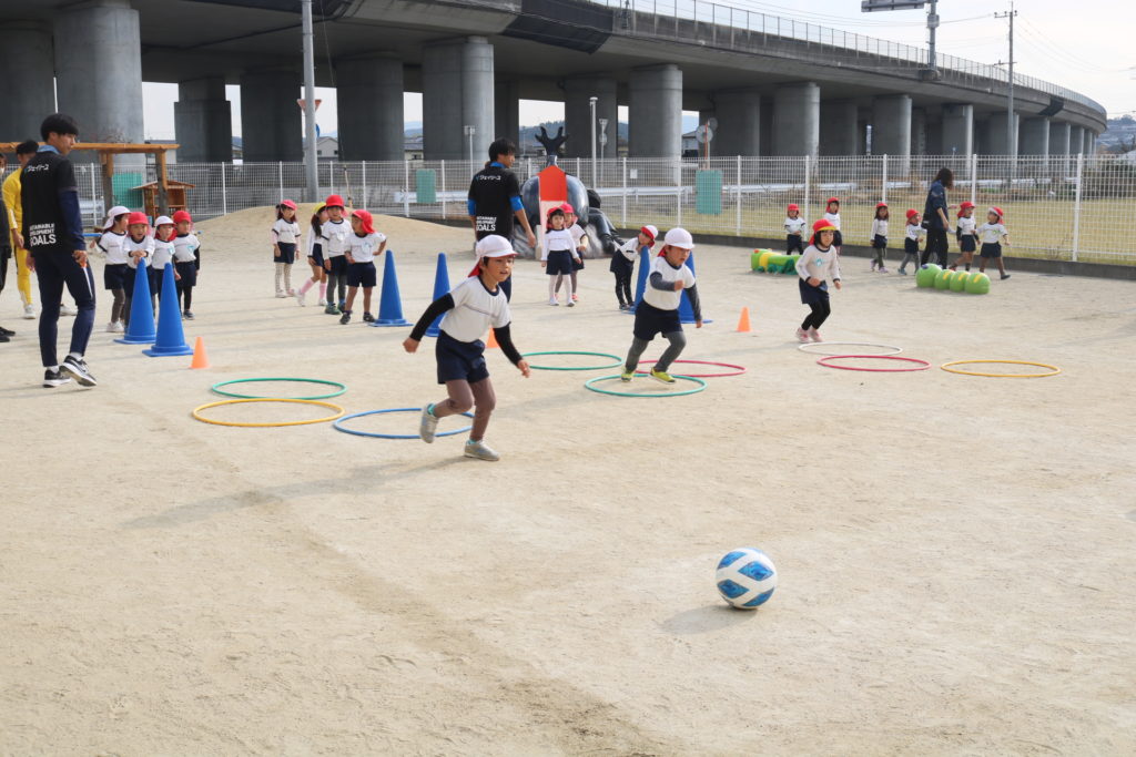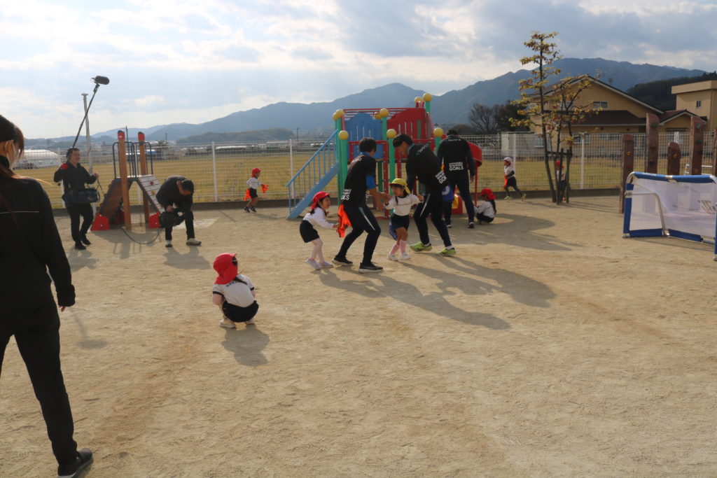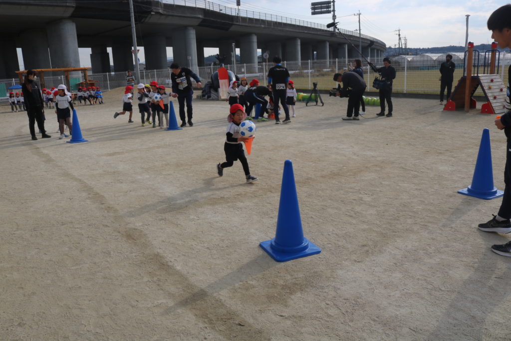 ジェイリースのサッカー選手によるサッカー教室がありました!まずは皆で、しっぽ取りをして体を十分に動かしていきました。お友達のしっぽをめがけて走り、そして逃げ回る子ども達です。体が温まるとボール運びやドリブルシュートにも挑戦しチームごとに競い合い楽しんでいました。最後には試合いを行い、皆で一生懸命はしってボールを追いかけまわして楽しむ事が出来ました。TVの取材も来ており、今日の感想を聞かれた子ども達は元気に明るく答えていました!放送が楽しみです。