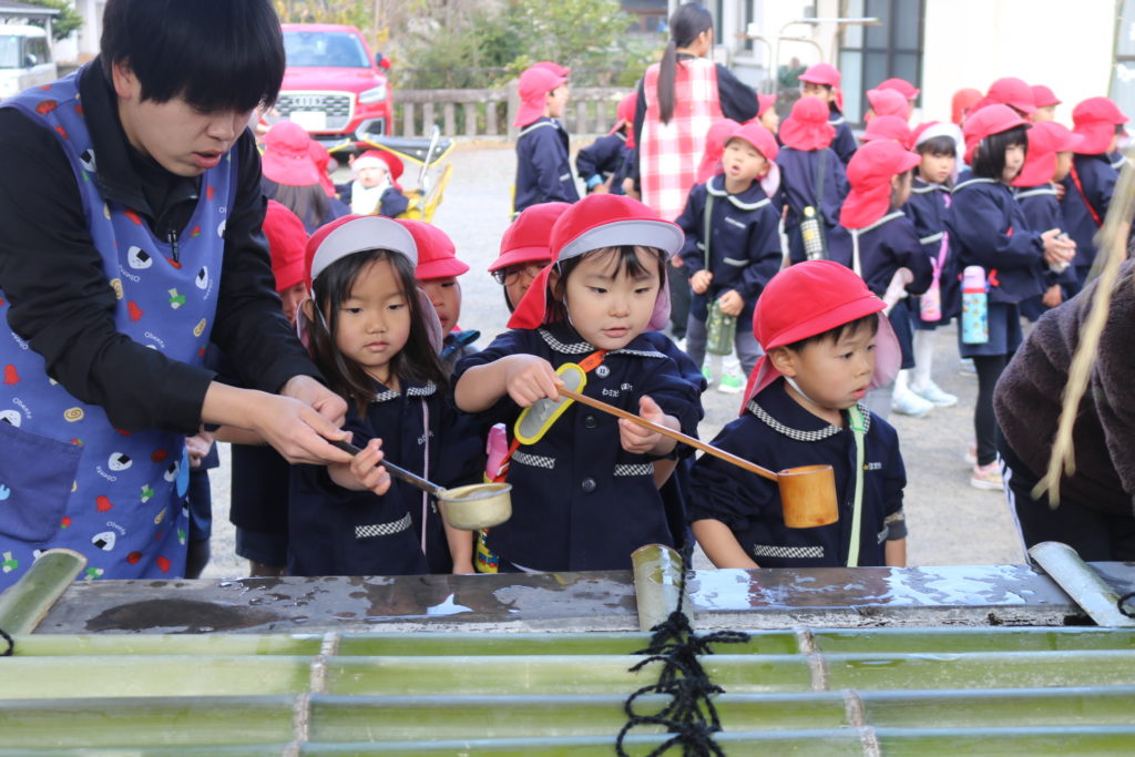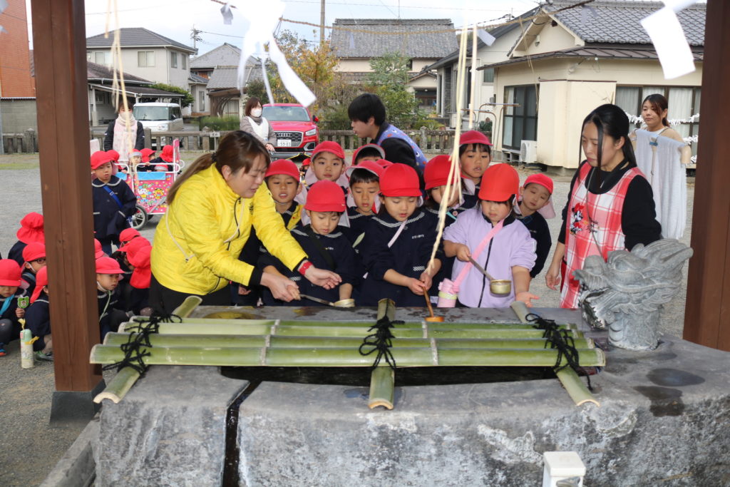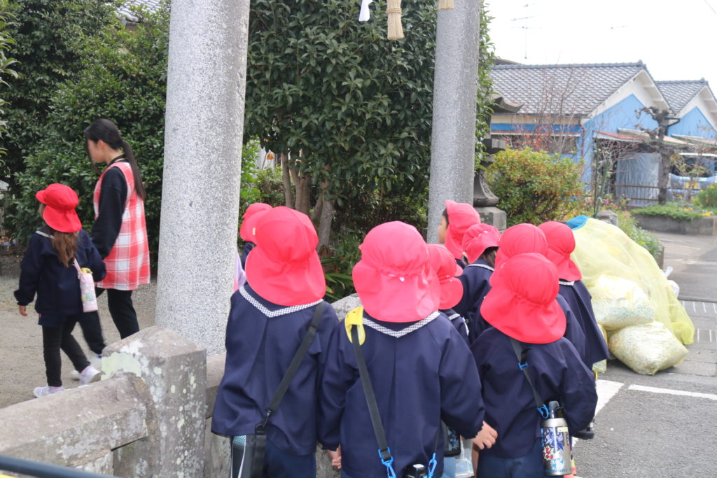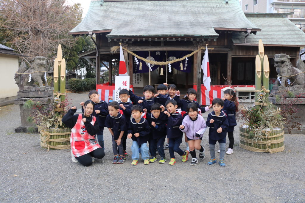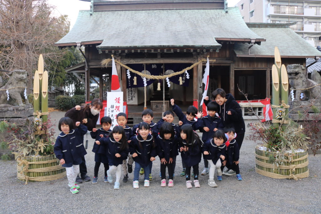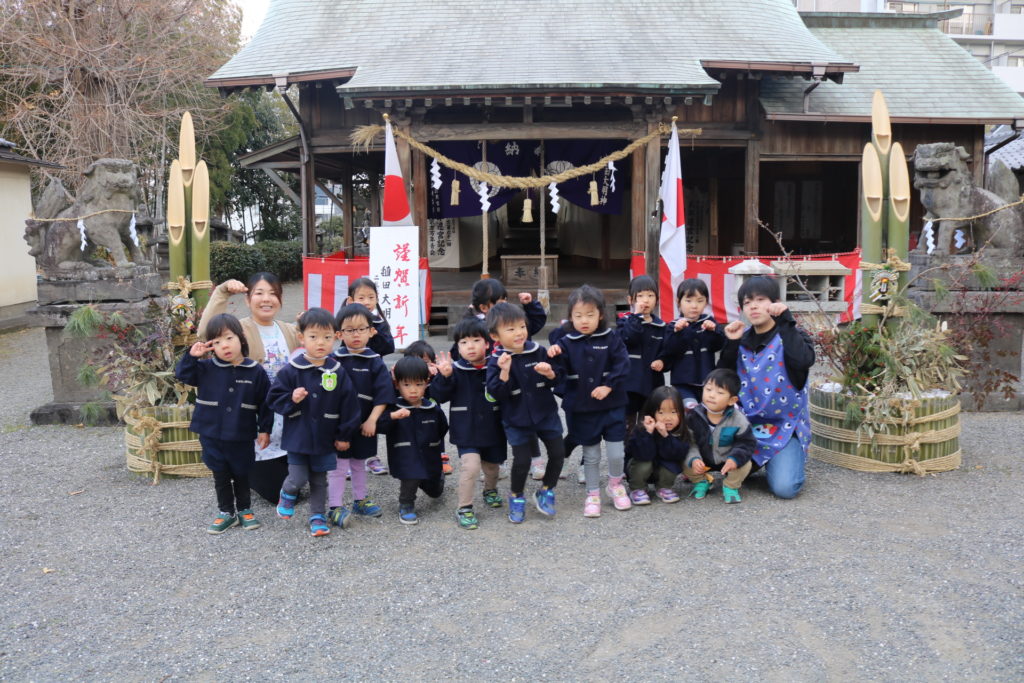 明けましておめでとうございます!御用始め早速、氏神様(わさだ大明神)に子ども達と一緒に初詣に行ってきました。神社、参拝する時の正義作法のお話をしっかりと聞いて先生達の真似をしながら、神様に今年のお願い事をしていきました。今年はうま年です。何事にも上手く(馬)いく!そんな年になりますように!