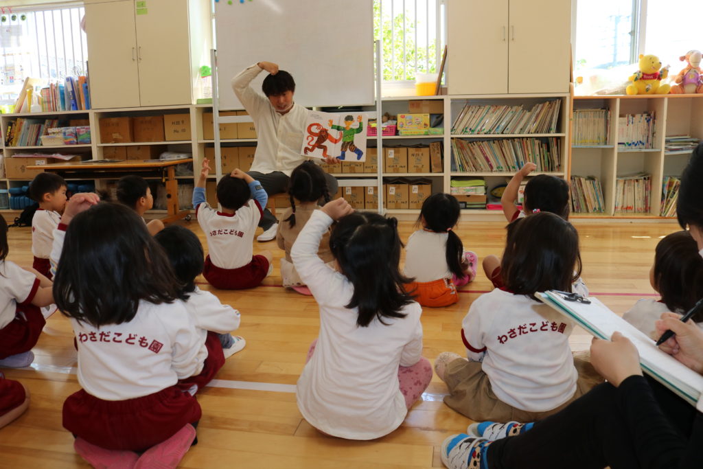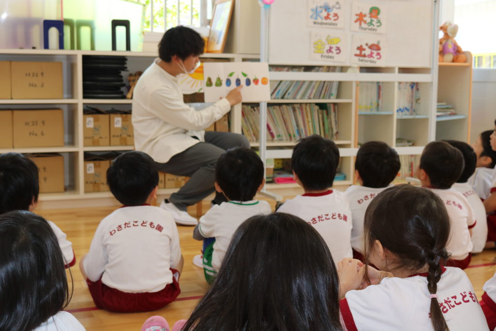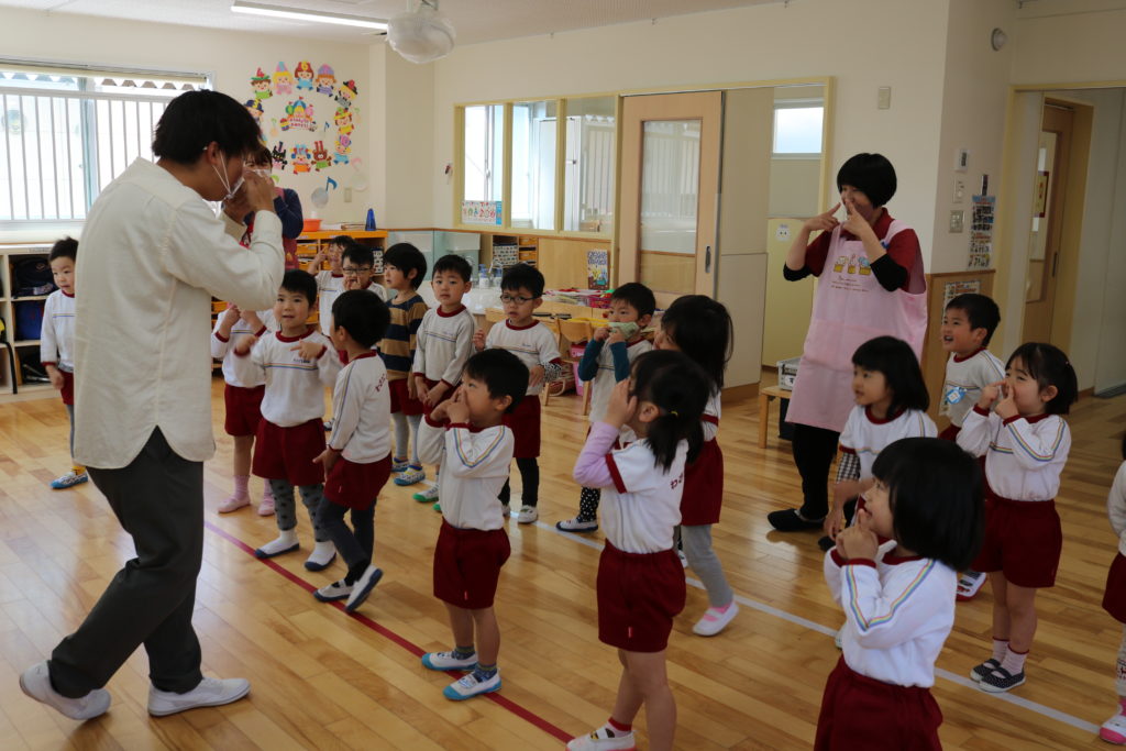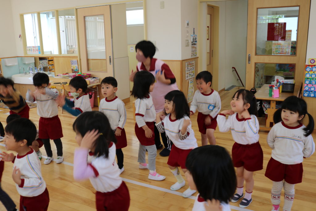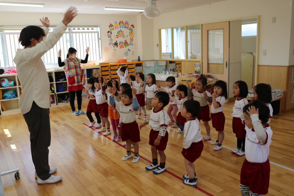英語教室 (3.4.5歳児) 今日は英語教室がありました。 3歳児めろん組は初めての英語教室でした。 表情からドキドキしている様子が見てわかりました。 最初はけん先生がしているのを、ジーっと見ている子どもたちでしたが、徐々に踊りながら歌う姿が見られました。 すいか組やぶどう組に入った新しいお友だちも楽しんで参加していました。 今年度も楽しんで取り組みたいと思います。 一覧へ戻る