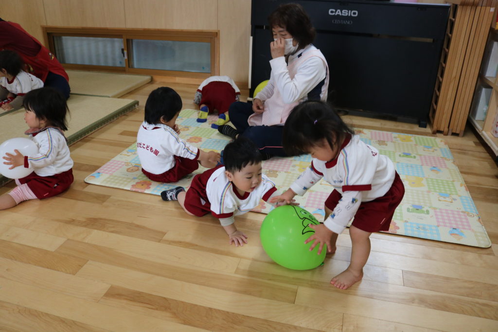 0.1.2歳児クラスの子ども達は、風船遊びや室内滑り台で遊んだりしました。
