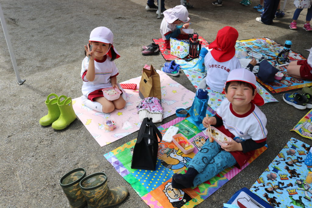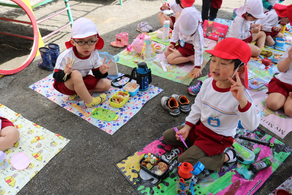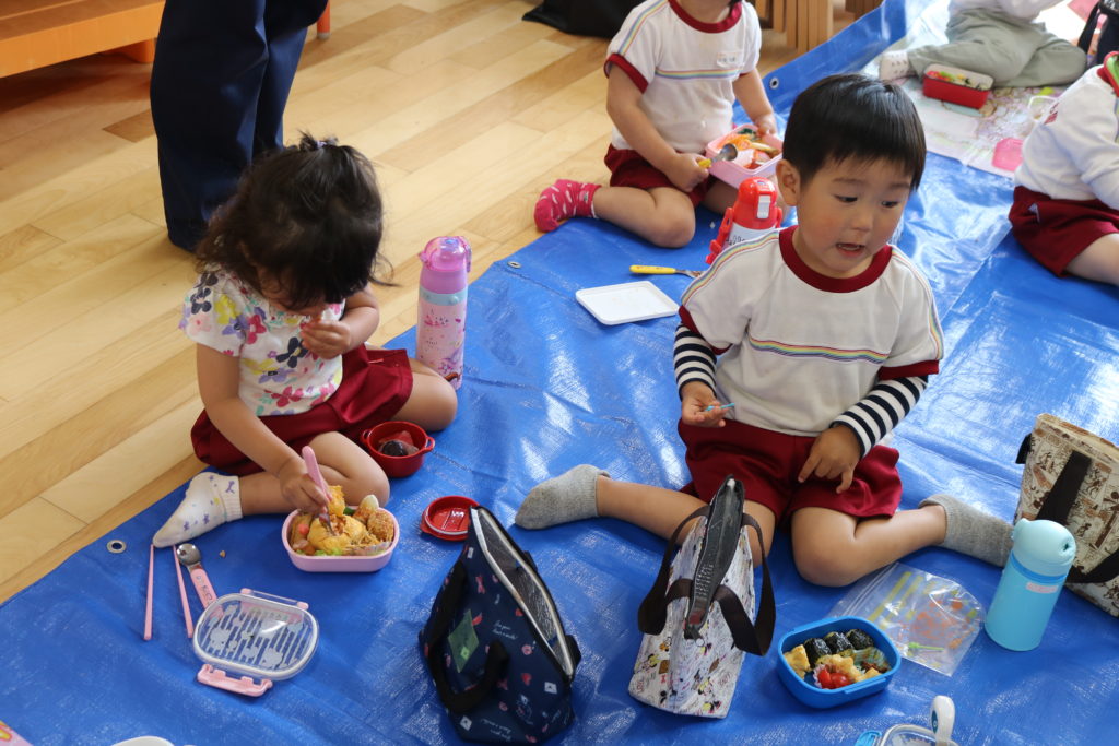 ごはんの時間には、すっかり雨もあがり、3.4.5歳児は園庭でお弁当を食べました。