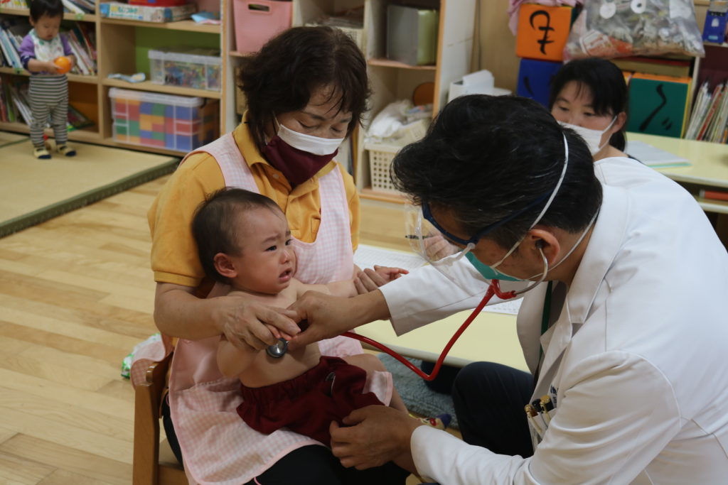 内科検診 今日は内科検診がありました。 お名前はなんですか?と尋ねられ、大きな声で答える子や、緊張し恥ずかしそうに答える子どももいました。 検診が終わると、ちょっと安心した様子で『ありがとうございました。』と言うことが出来ていました。 一覧へ戻る