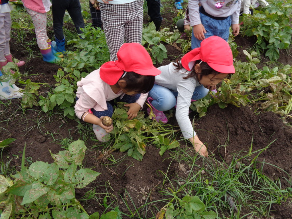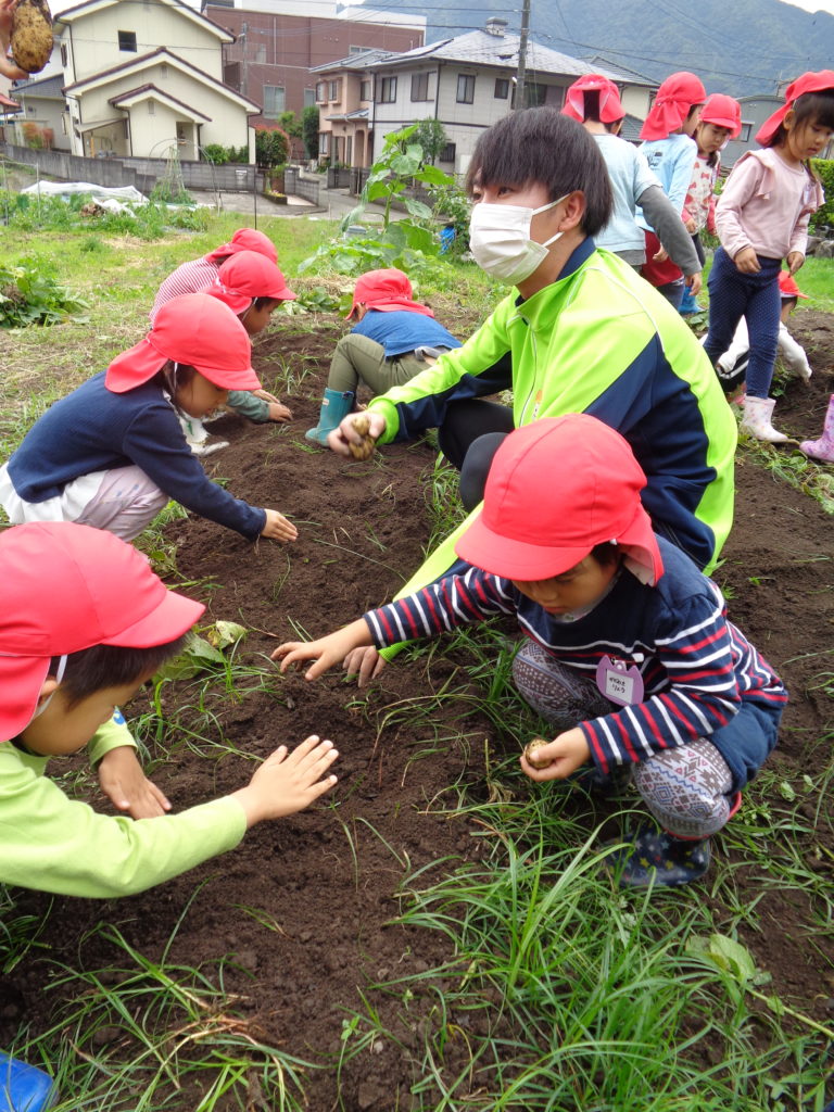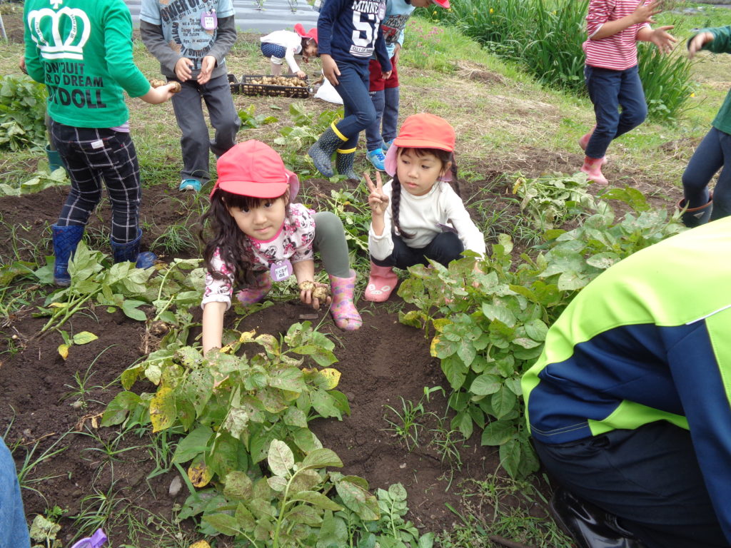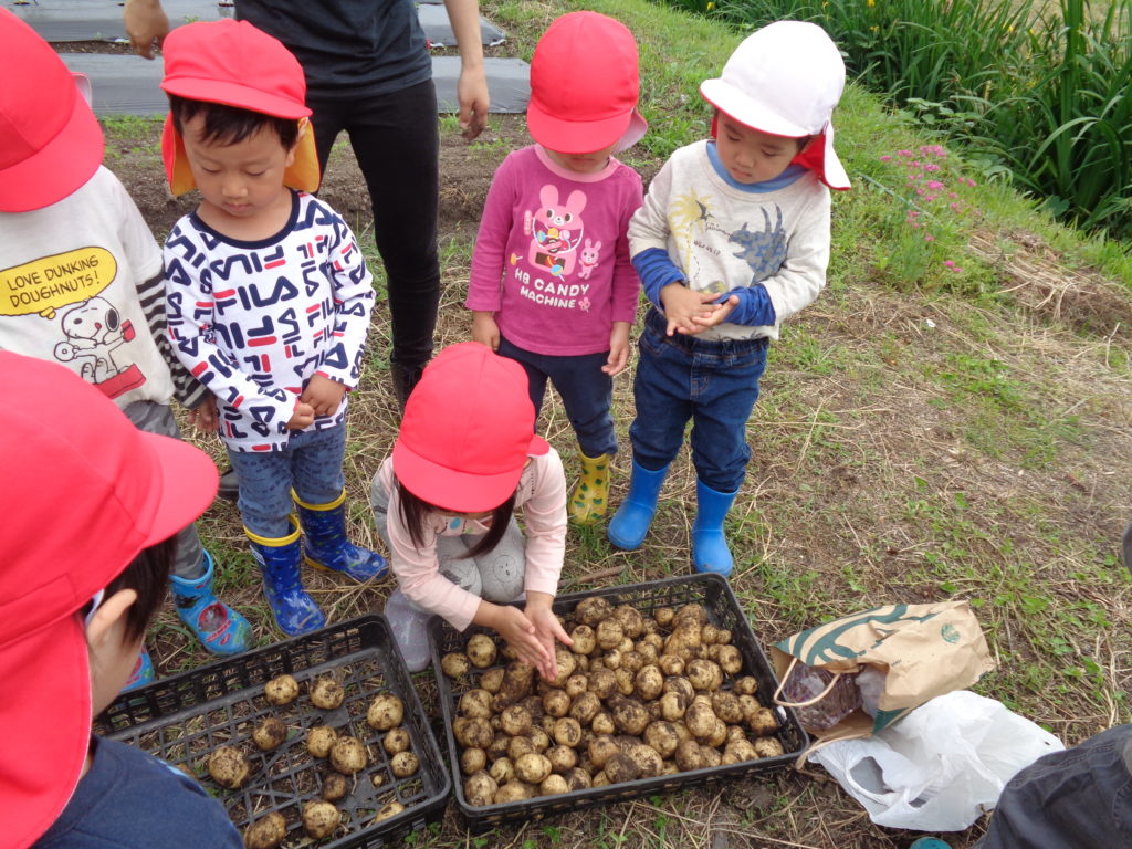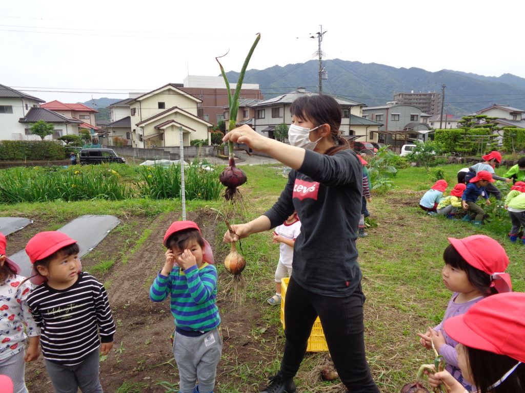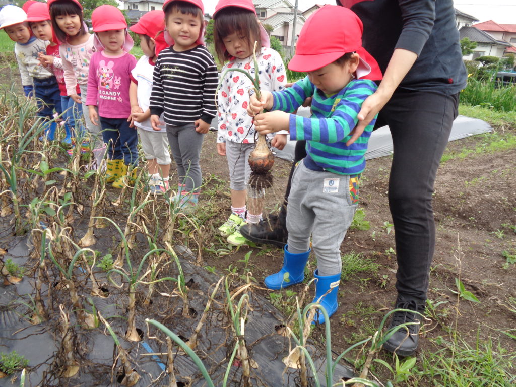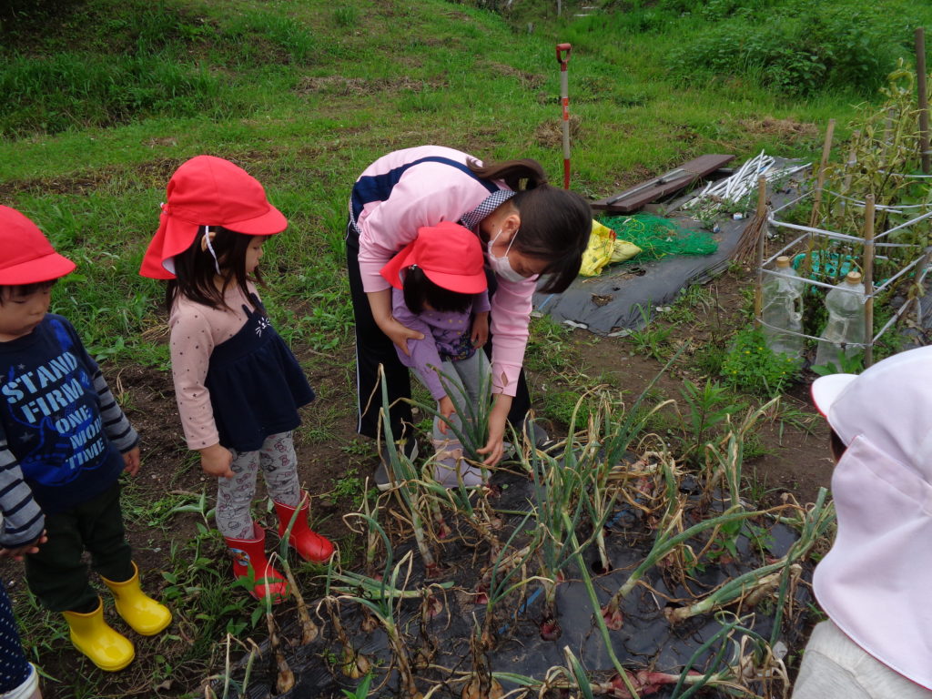 じゃがいも たまねぎ収穫 今日は、めろん組・ぶどう組が畑に行き、じゃがいもとたまねぎ収穫をしました。 ぶどう組はじゃがいもの掘り方を教えてもらい、めろん組は玉ねぎを収穫しました。 大きいのが採れた!!これは小さい!!などなど・・友だちと見せ合いっこをしながら、 楽しんでいました。 今年度も色々な種類の苗を植え、これからの野菜の生長や収穫が楽しみな子ども達です。 一覧へ戻る