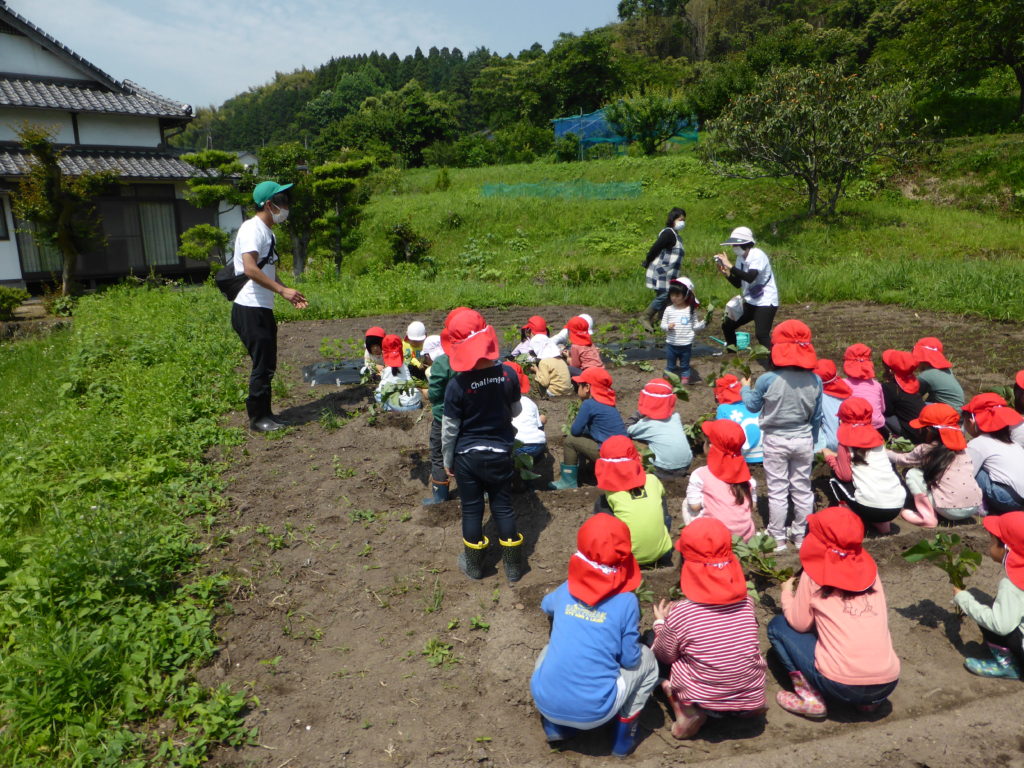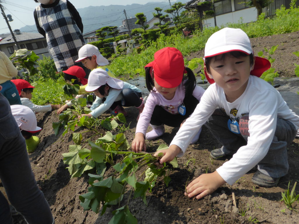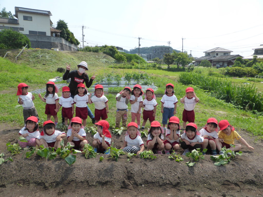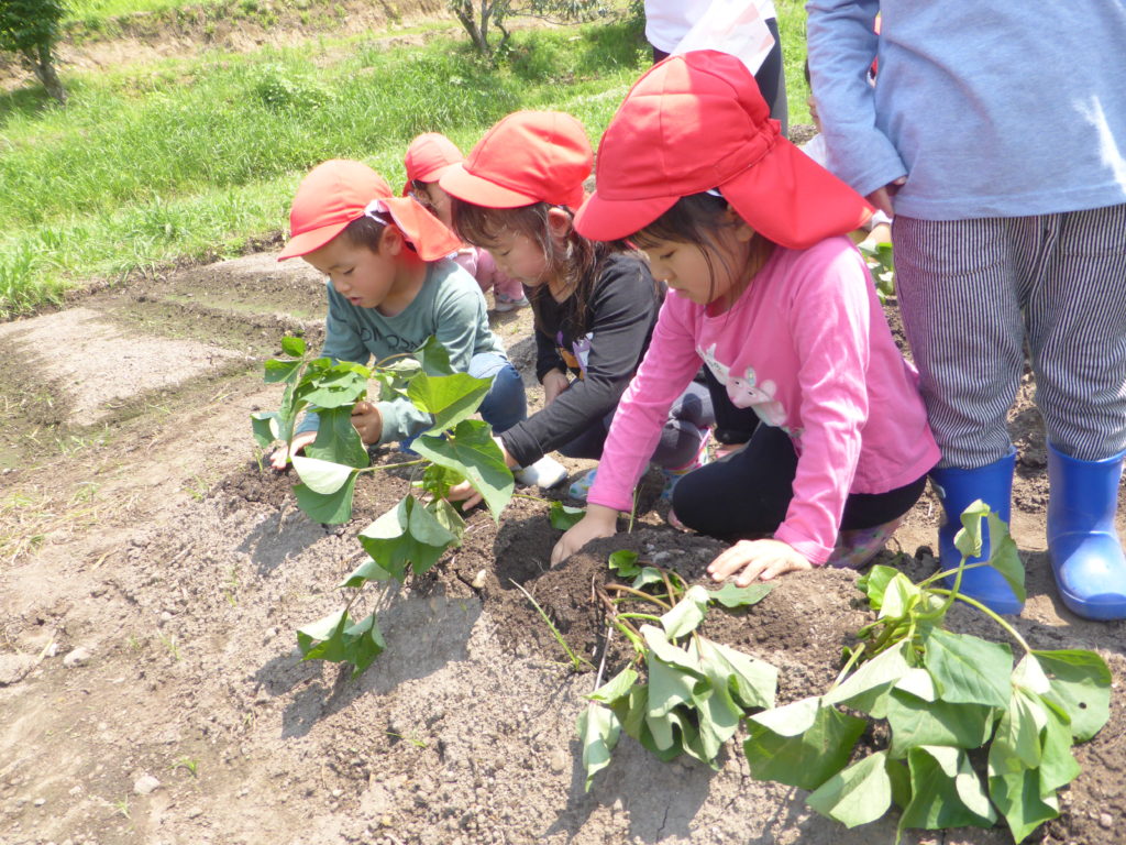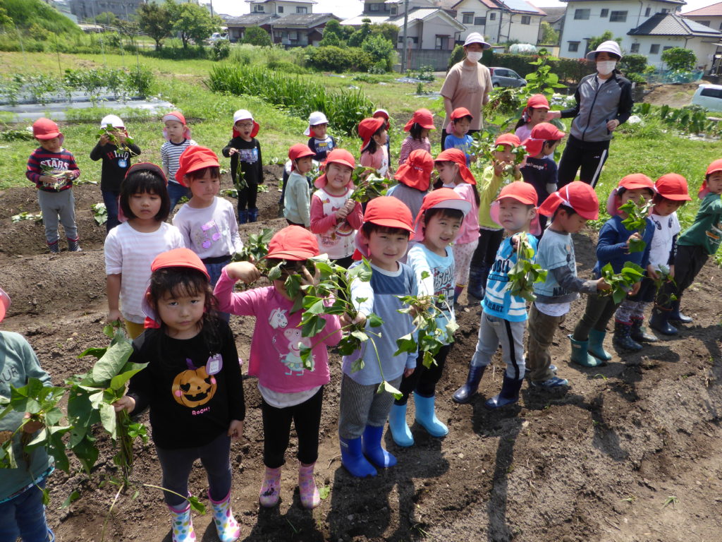 さつまいもの苗植え 今日は、さつまいもの苗植えに行きました。 どうやって植えるのかを教えてもらいながら、一人1本ずつ、植えることが出来ました。 『大きくなぁれ!!大きい芋ができますように』と願いを込めながら植えていました。 今から、さつまいもの収穫が楽しみな子どもたちです。 これから、収穫まで観察に行きたいと思います!! 一覧へ戻る