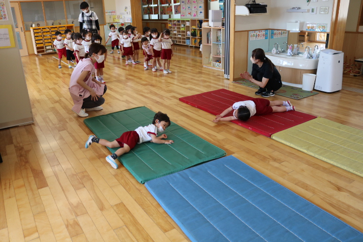 3歳児さんは、マット運動から入りました。マットの上にロケットのようにねっころがり、