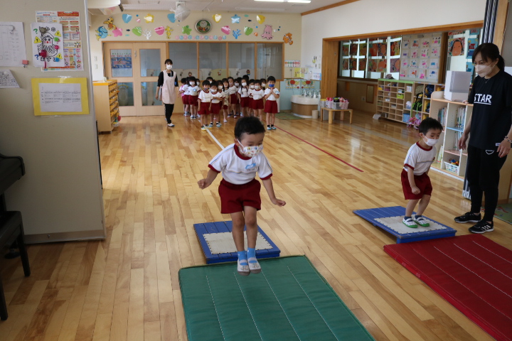 5歳児さんは、みんなが跳び箱5段を跳べるようになるのが目標です。