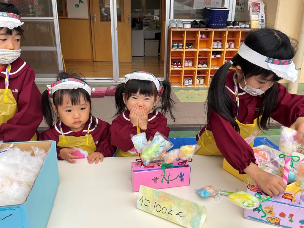 「いらっしゃいませー!」「どれにしますか?」「これください」「ありがとうございました」などなど、買い物をしながら様々な言葉が飛びかっていました。年長さんは1歳児クラスの子とペアになり、年中さんは2歳児クラスの子達とペアになって一緒に買い物をしたり、お店屋さんの定員をしました。優しく関わりながらお世話をしてあげている姿はとても素敵でした。小さい子達は日々このような経験を通して人と関わる力の基礎を培っていき、思いやりや気遣いあたたかい心を膨らませていく事なんだろうと感じる瞬間が沢山見られました。楽しくて賑やかな、お店屋さんごっこになりました。このような関わりを大切にし、これからも続けていきたいです。