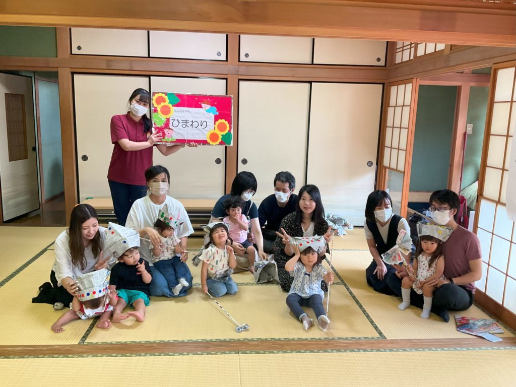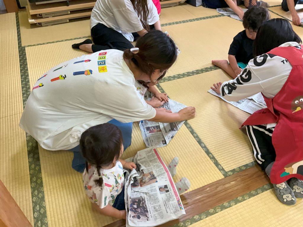 今回は新しく参加していただいた方もいて、みんなで楽しく雨の日にお家でもできる新聞紙・広告遊びを行いました。