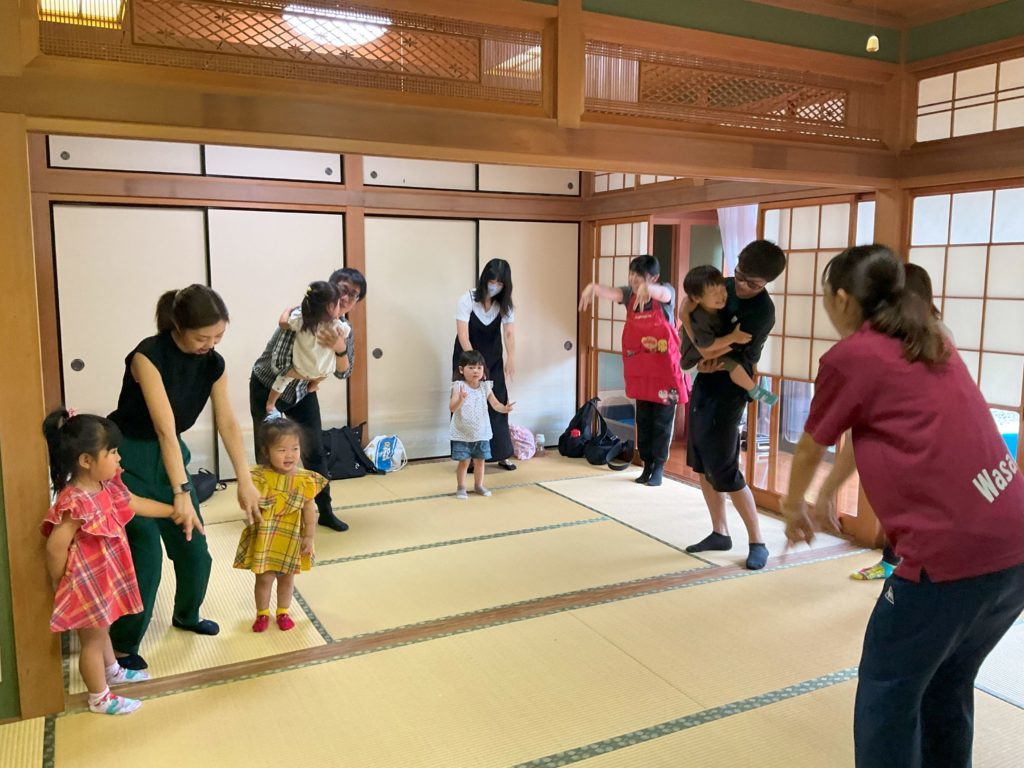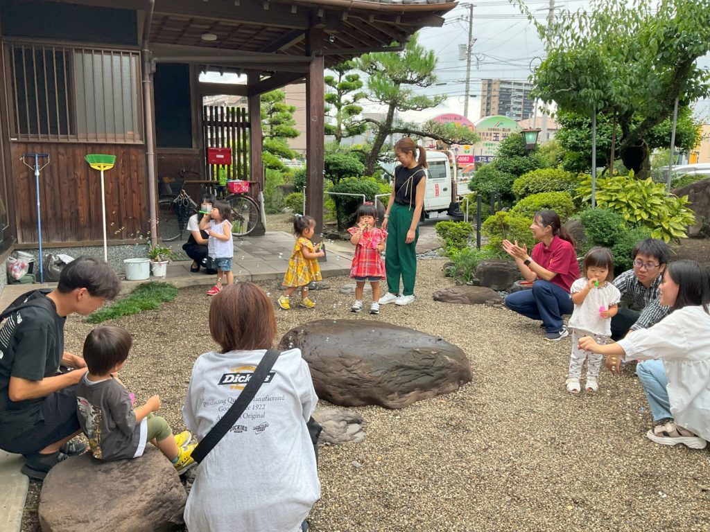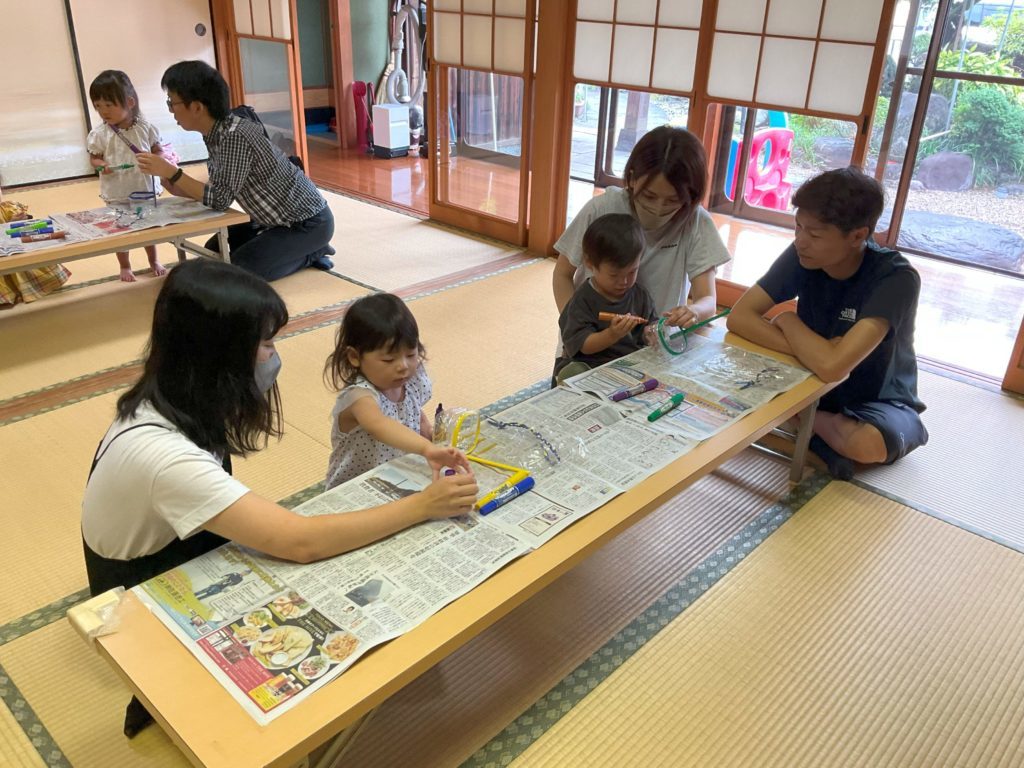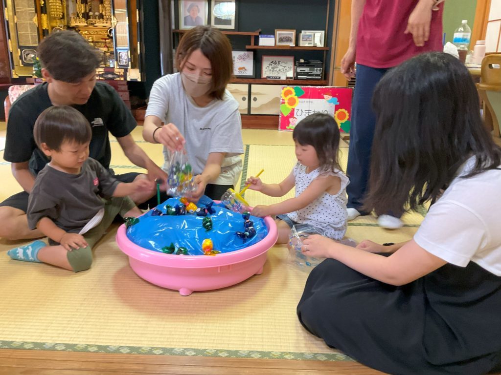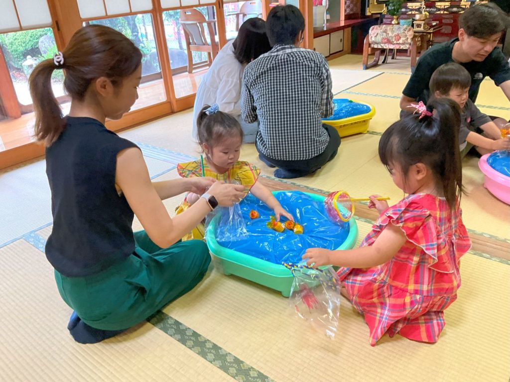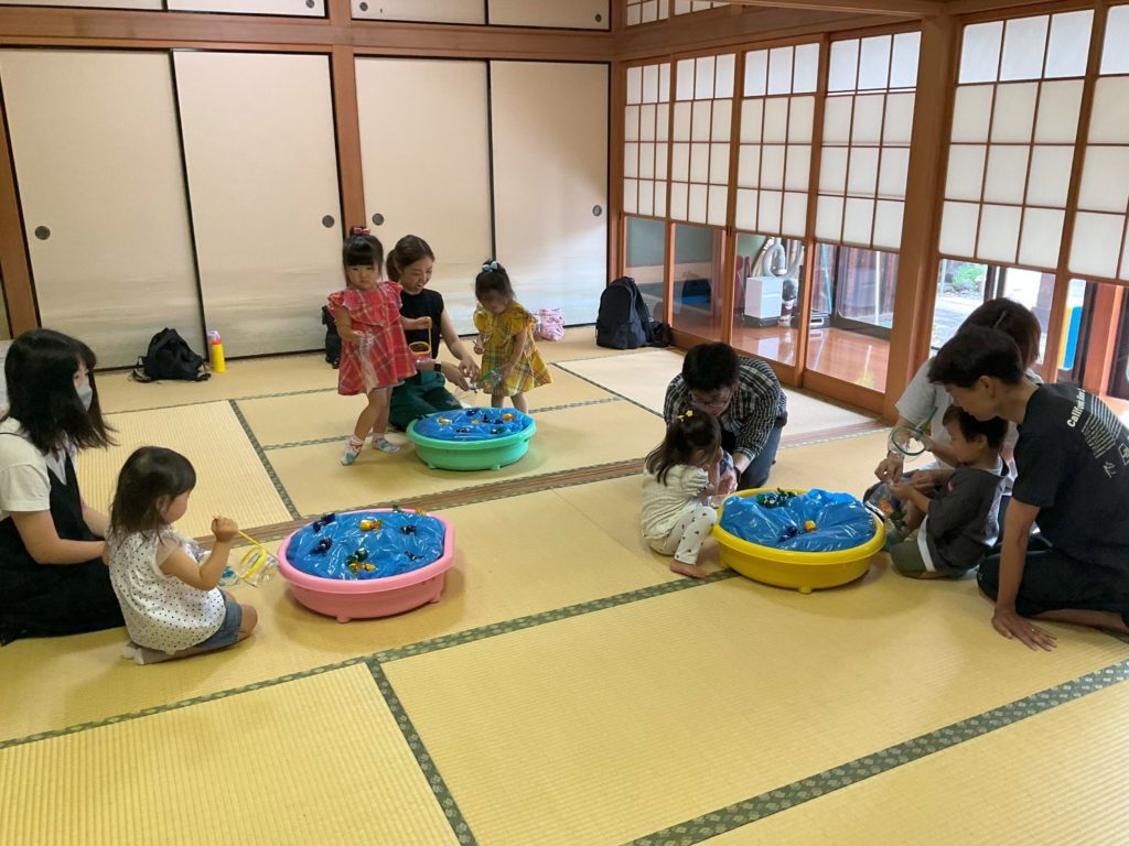 当日朝から雨が降っていたので、室内での魚つり遊びになりましたが、参加者同士交流しながら和気あいあいな雰囲気の中楽しく魚釣りが出来、その後も座布団取りゲームや雨が止んだので、庭でシャボン玉をして楽しい時間を過ごしました。