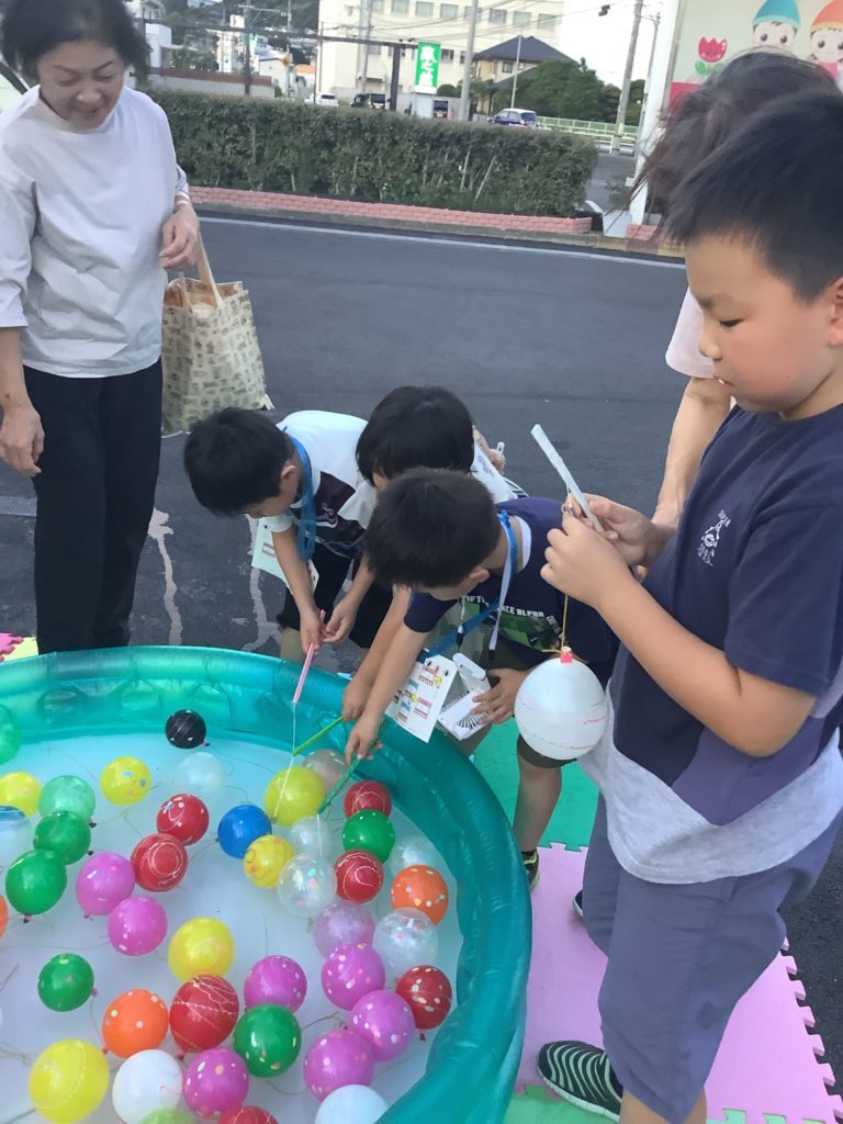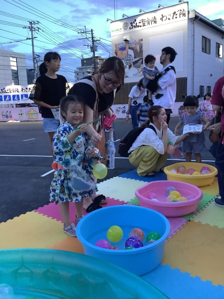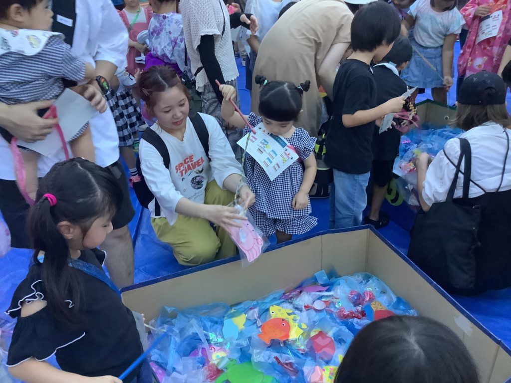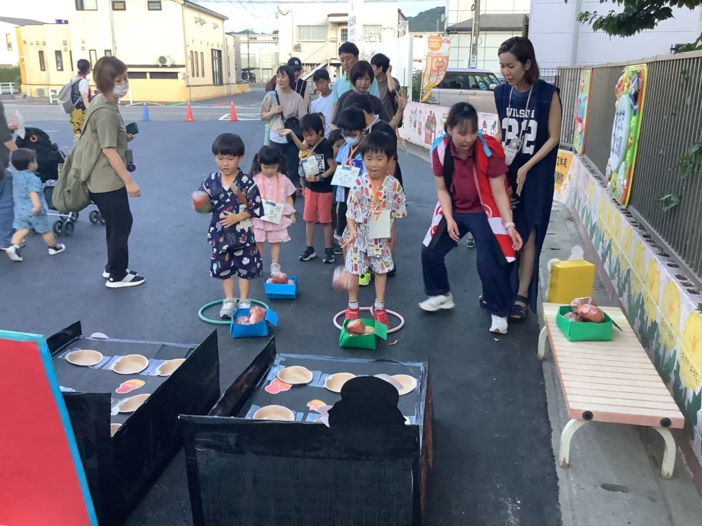 パネルシアターの「とんでったバナナ」で始まり出店には、たこやきビンゴ、的あて、フォトブース、魚釣り、ヨーヨー釣り、ワ二ワ二パニックと様々なゲームコーナーが並び、子ども達はスタンプカードを見ながら順番に回っていました。
