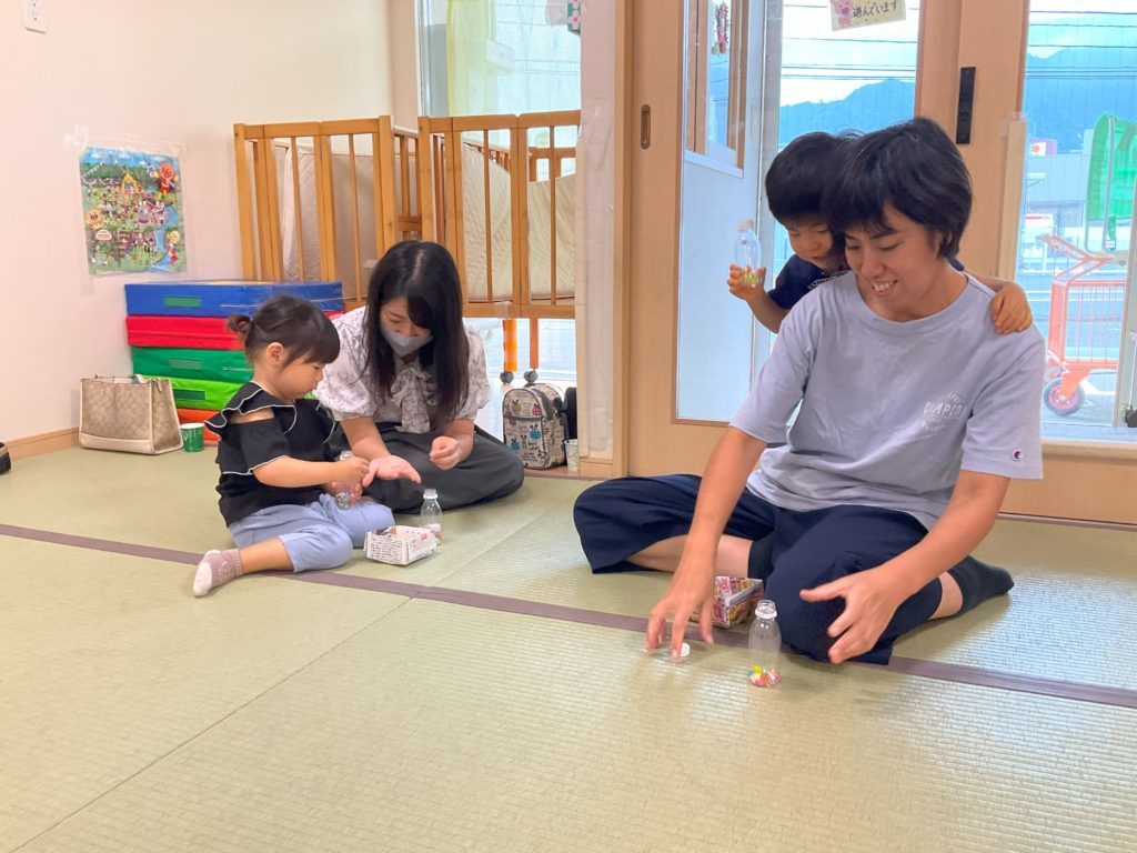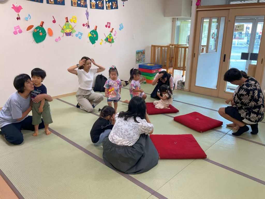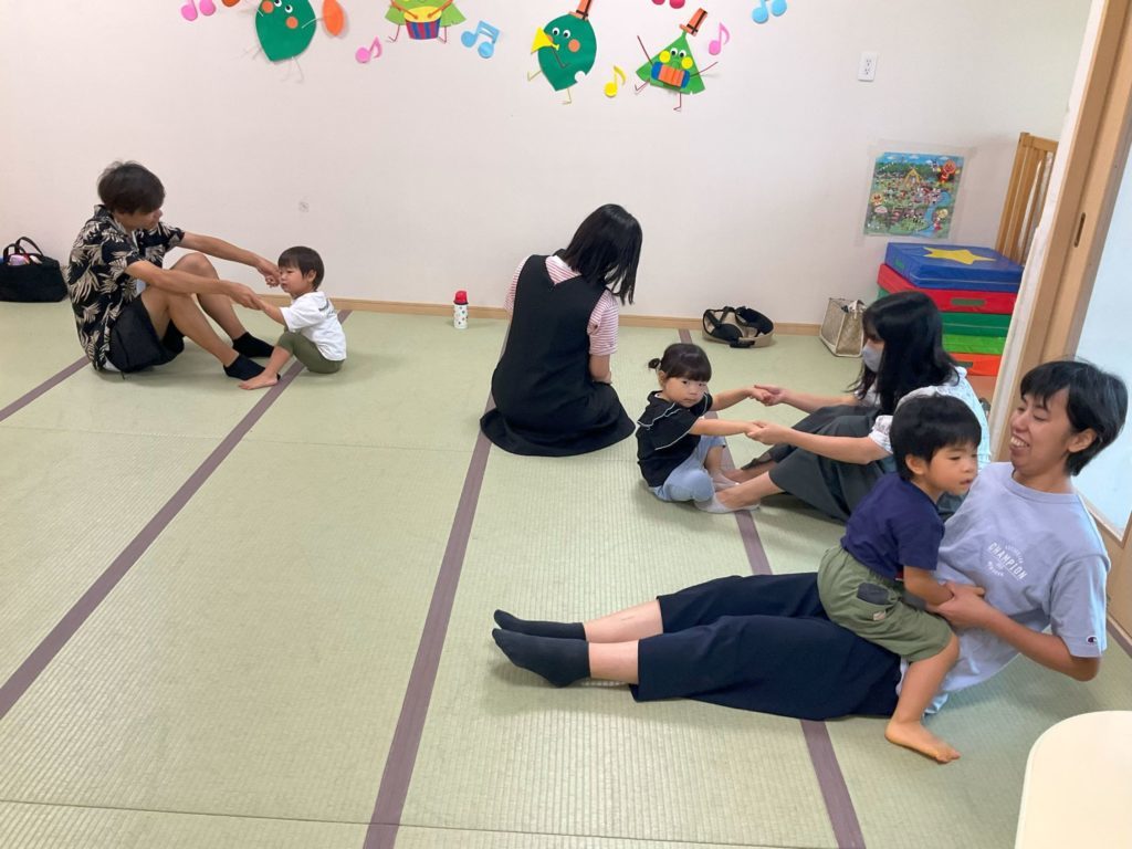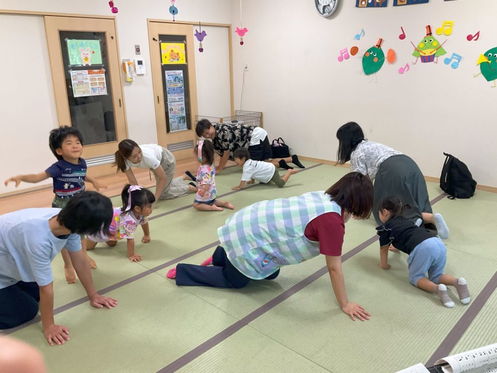 ピアノの曲に合わせて親子で部屋の中を散歩して、一緒に参加しているお友だちと挨拶や自己紹介をしたり、トンボやウサギ、カメさんになりきって親子で楽しく身体を動かしました。
