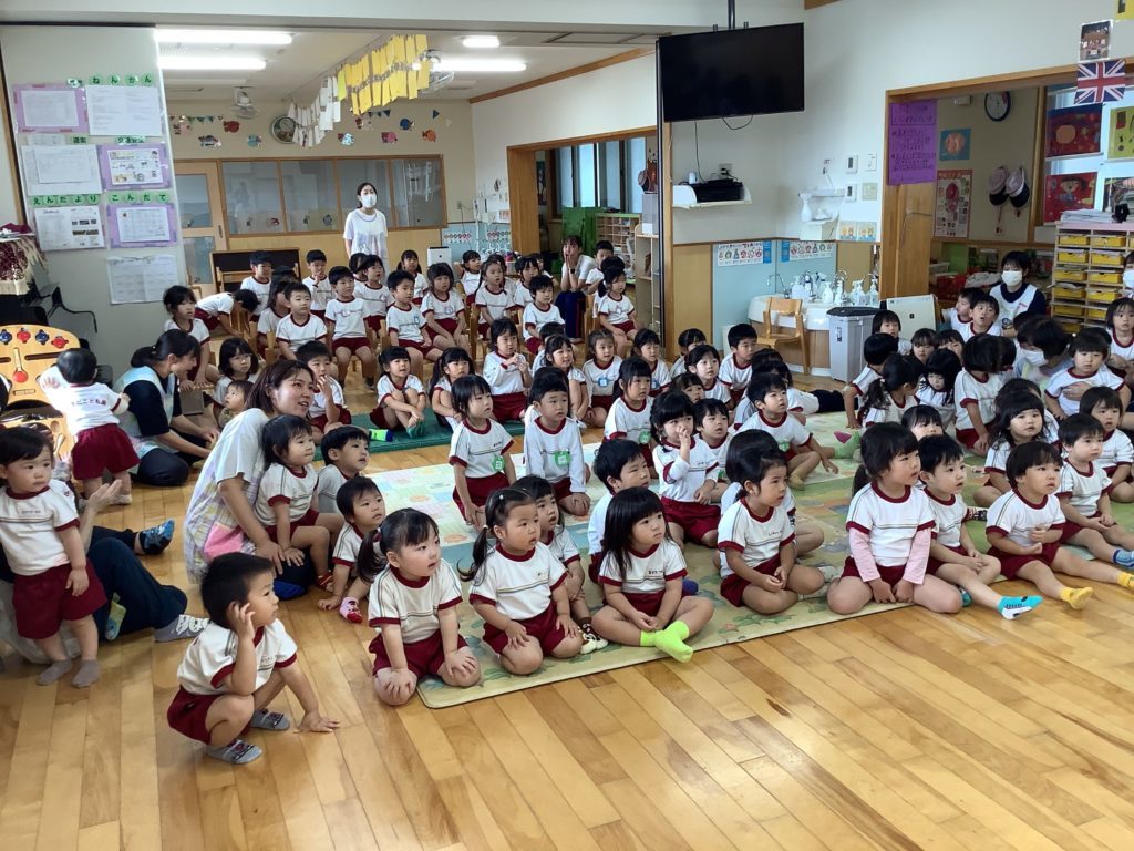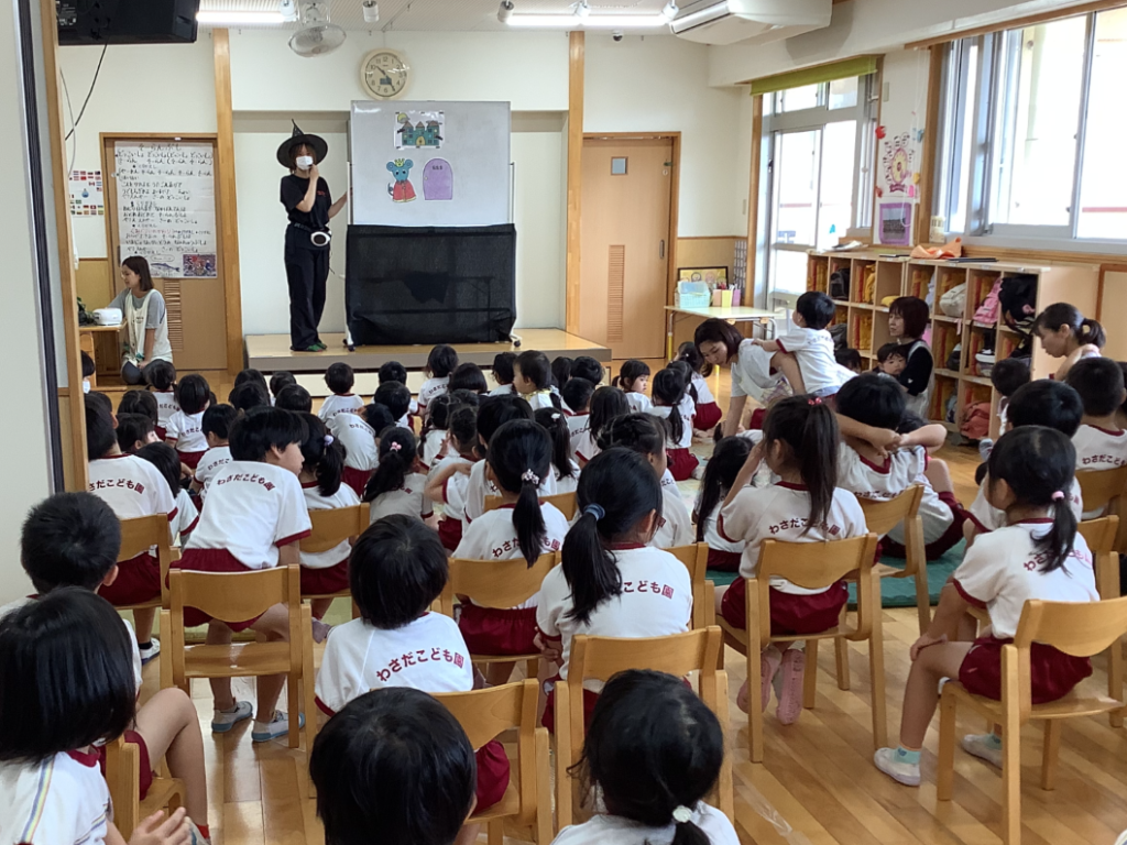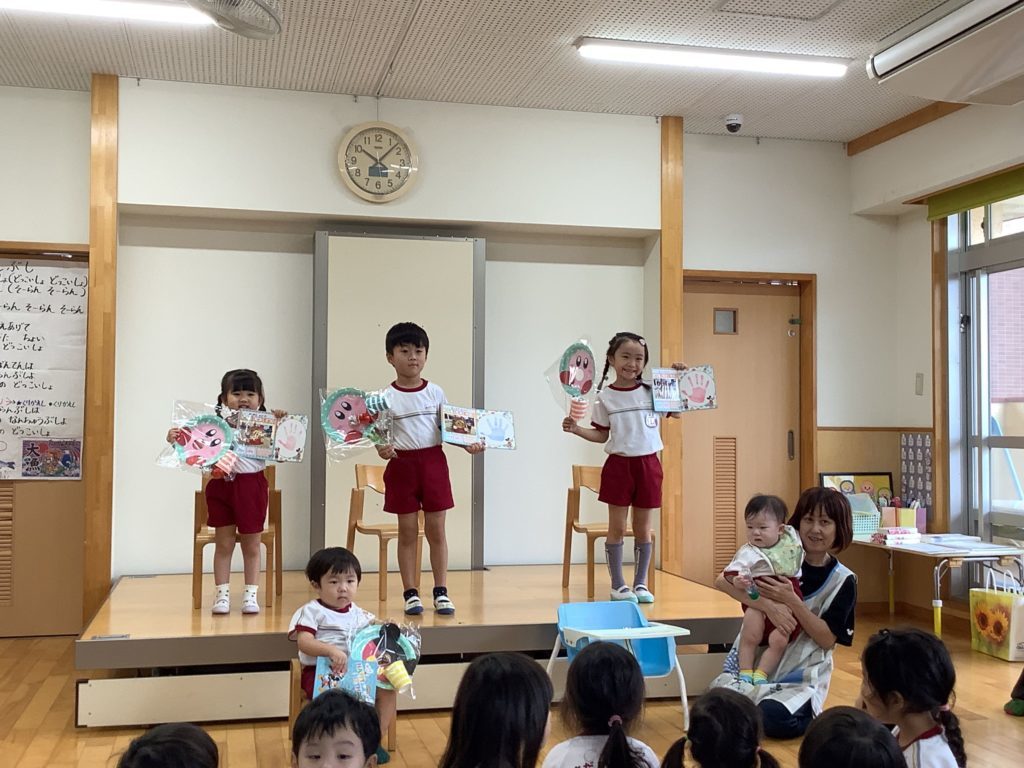 10月の誕生日会 今日は、10月生まれの誕生日会がありました。5人のお誕生日のお友だちが前に出て、みんなでお祝いをしました。 季節の歌を歌ったり、誕生日の友だちに質問したりして楽しく参加していました。出し物はハロウィンにちなんだ物でした。おばけがちょっと怖かったみたいで、目を隠してチラチラ見る姿が可愛らしかったです。 ☆彡10月生まれのお友だち お誕生日おめでとう☆彡 一覧へ戻る
