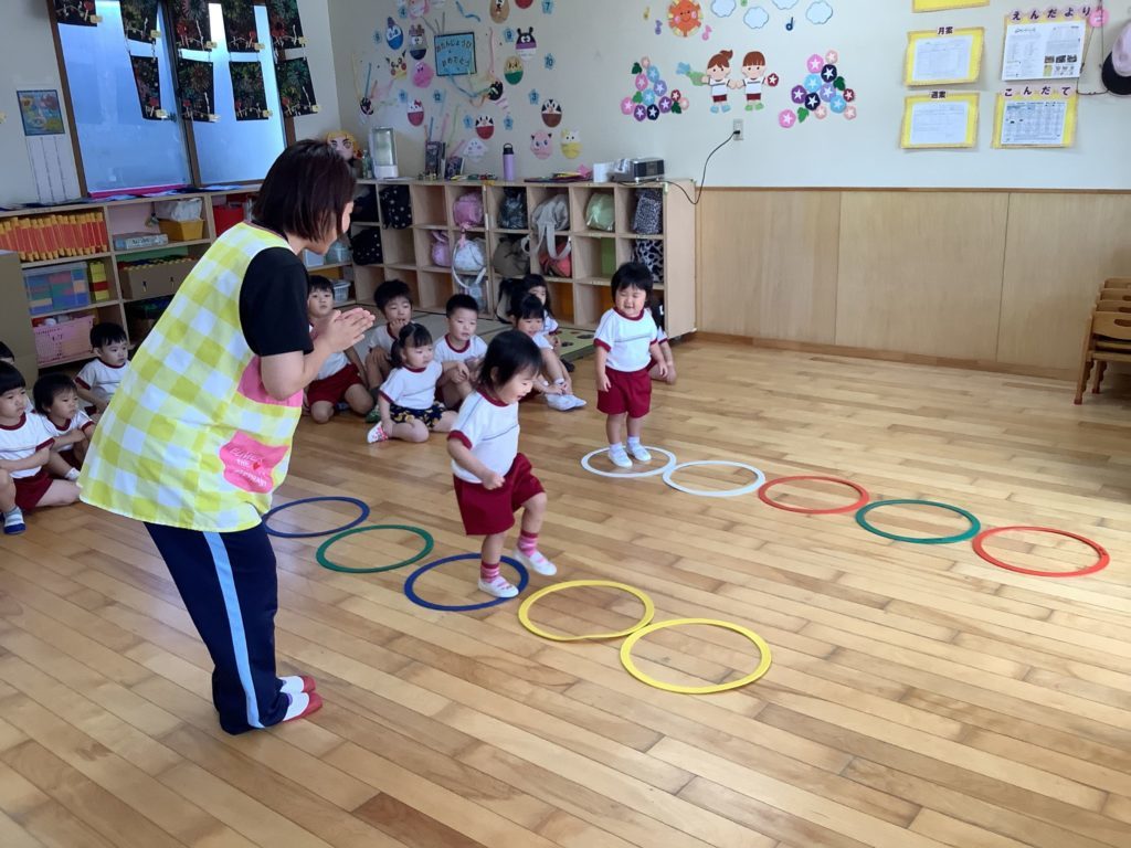 リズムよくフープをジャンプ!両足ジャンプが日に日に上手になってきています。
