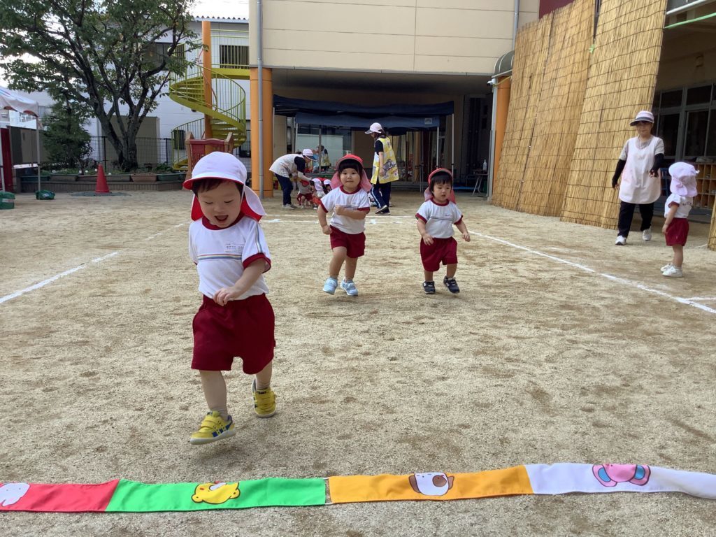 「よーい、ドン!」笛の合図で元気よく走り出し、笑顔でゴール!
