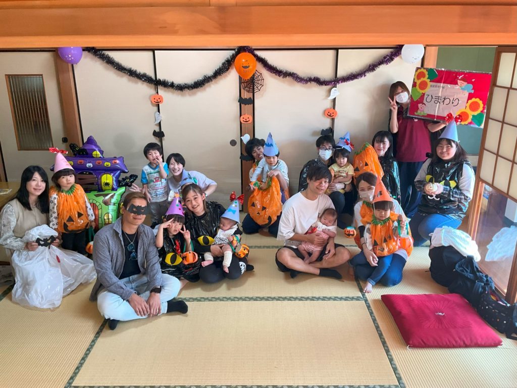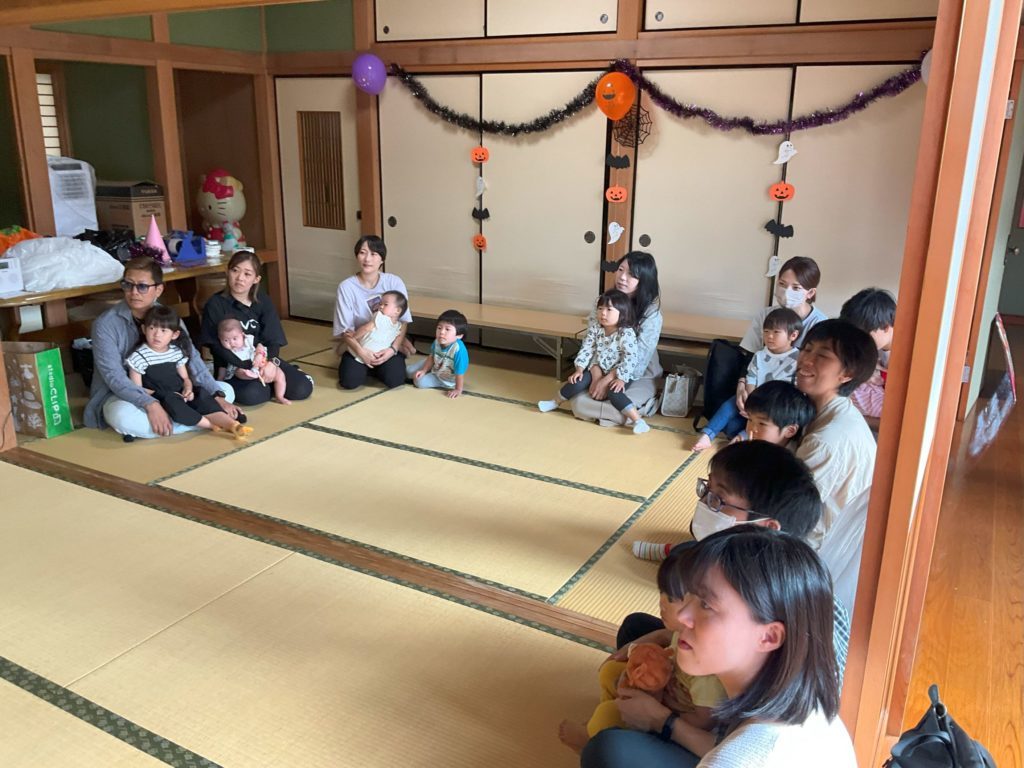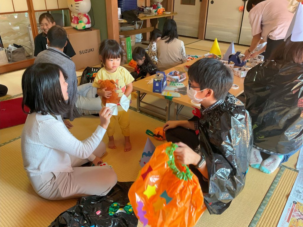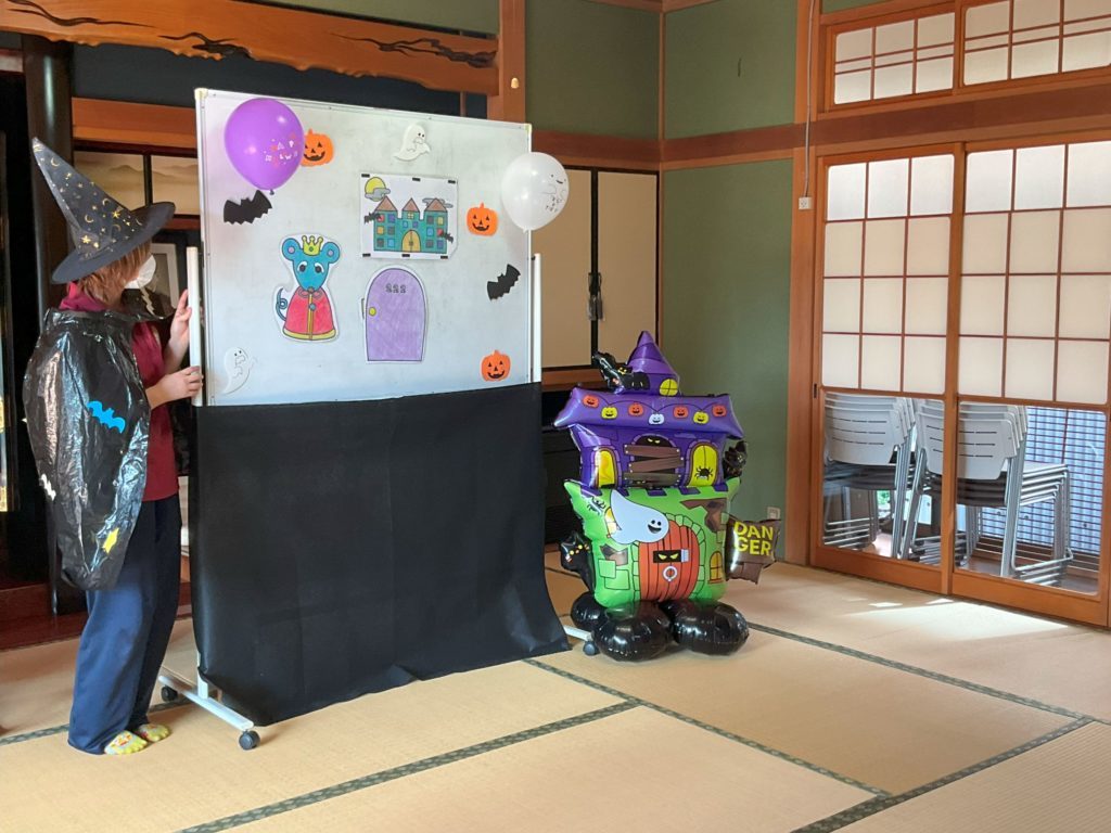 ドラキュラや猫お化け、ネズミの王様、魔女などたくさんのお化けが次々に出てきて興味津々に見ていた子ども達。保育教諭の歌に合わせて手拍子をうったり、お化けの家のドアを「トントントン」と一緒に叩いてくれるなどの姿も見られました。