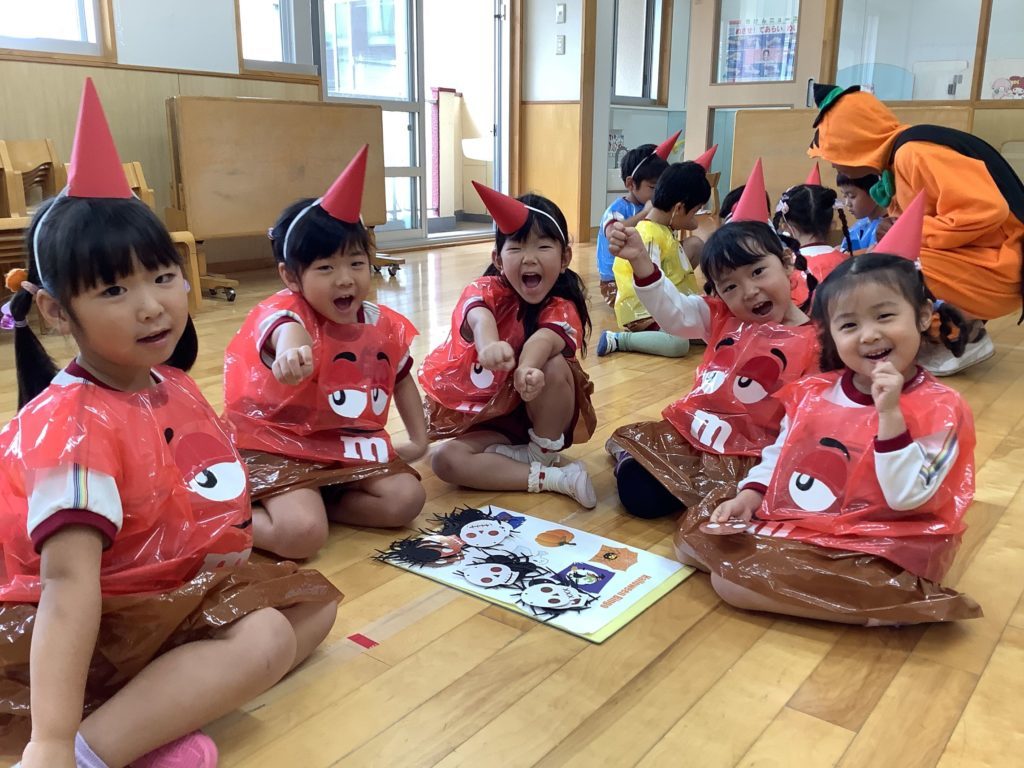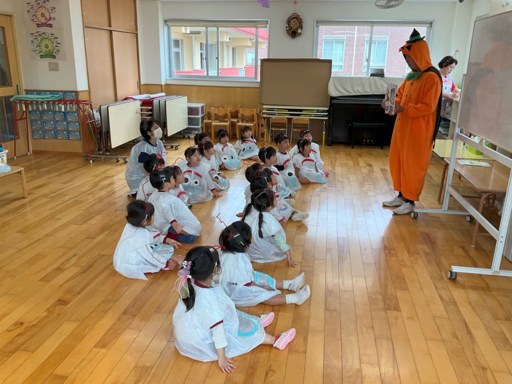 ハロウィン会の中で「ハロウィンの由来」や「なぜ仮装をするのか」などの話があり、子ども達は興味津々で聞いていました。