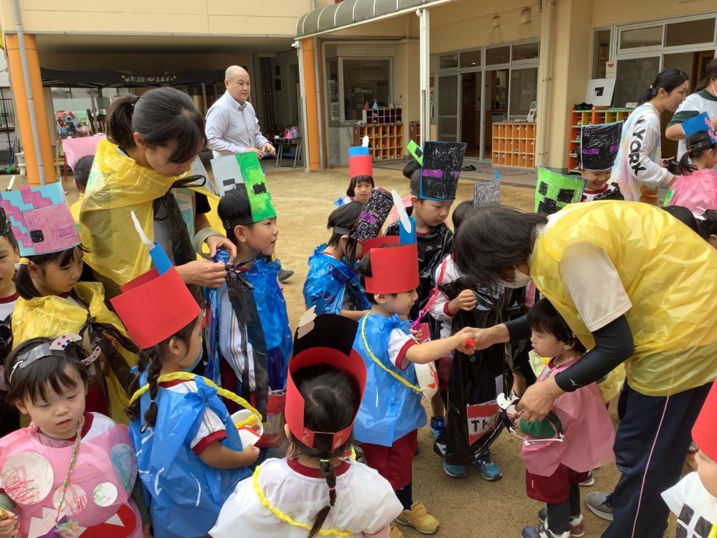 異年齢交流で手作りのキャンディーを「トリックオアトリート、お菓子をくれないといたずらしちゃうぞ」の言葉を言いながら交換しました。