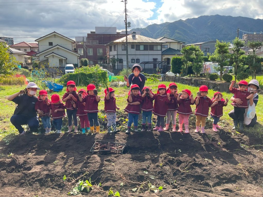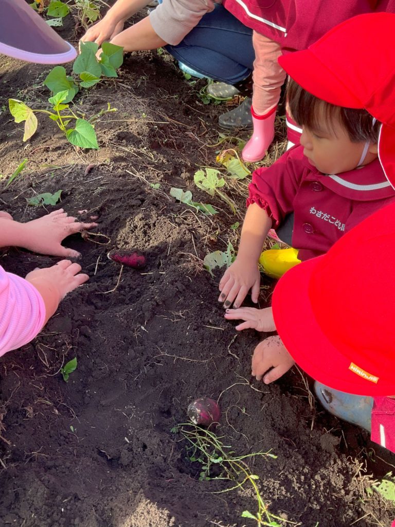 出てきたお芋の大きさに喜んだり、小さいお芋を見つけて見せ合いっこをして大笑い!!