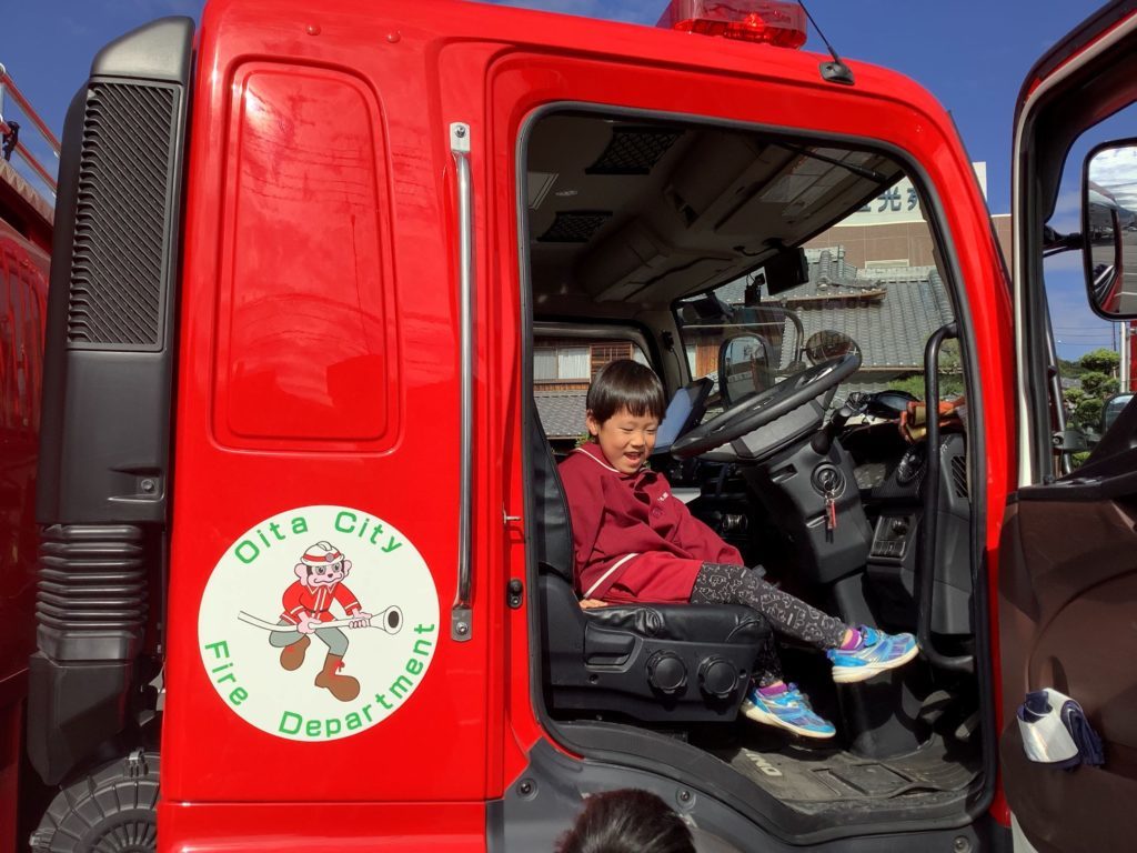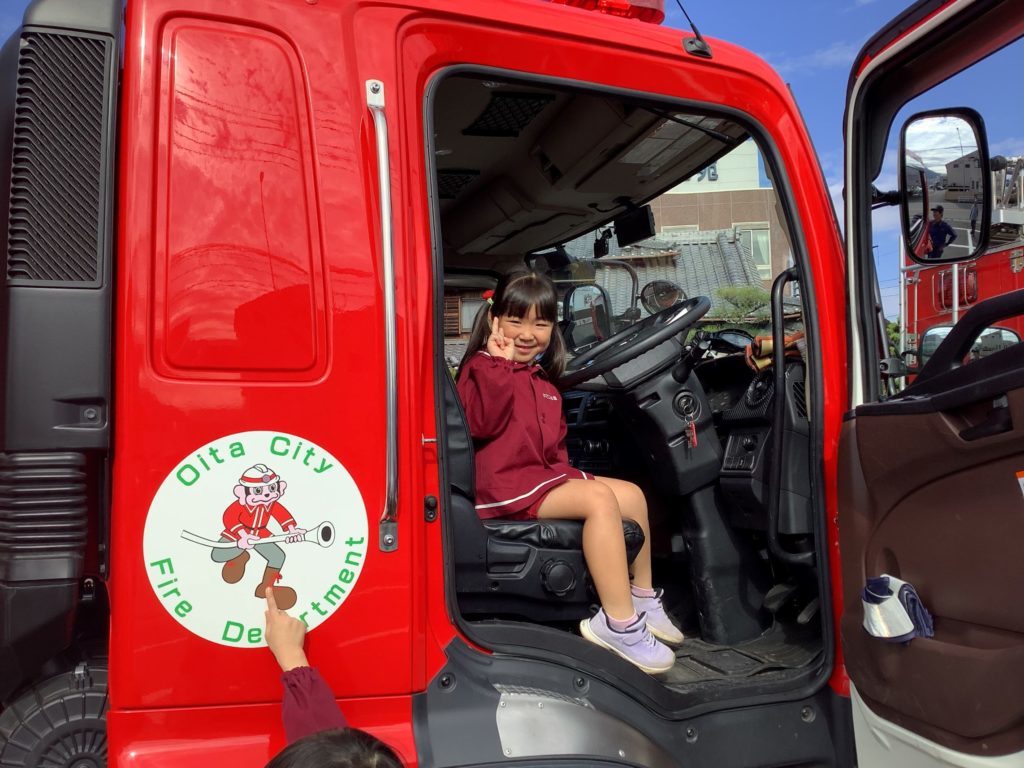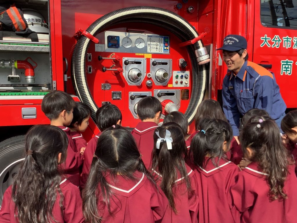 お話の後は消防車見学がありました。園の駐車場に2台の消防自動車が来てくれ、消防隊員の方から消防車によって名前や働きが違うことを教えていただき、説明を興味津々で聞いていました。気になった道具など積極的に質問する姿や消防車の運転席に乗せてもらい大喜びの子ども達でした。また4歳児すいか組の子ども達は、消防隊員の方の服も着せてもらい、出動の際はこの服を着ていくのだと服を何度も見つめていました。