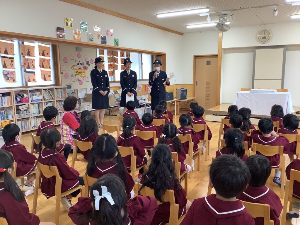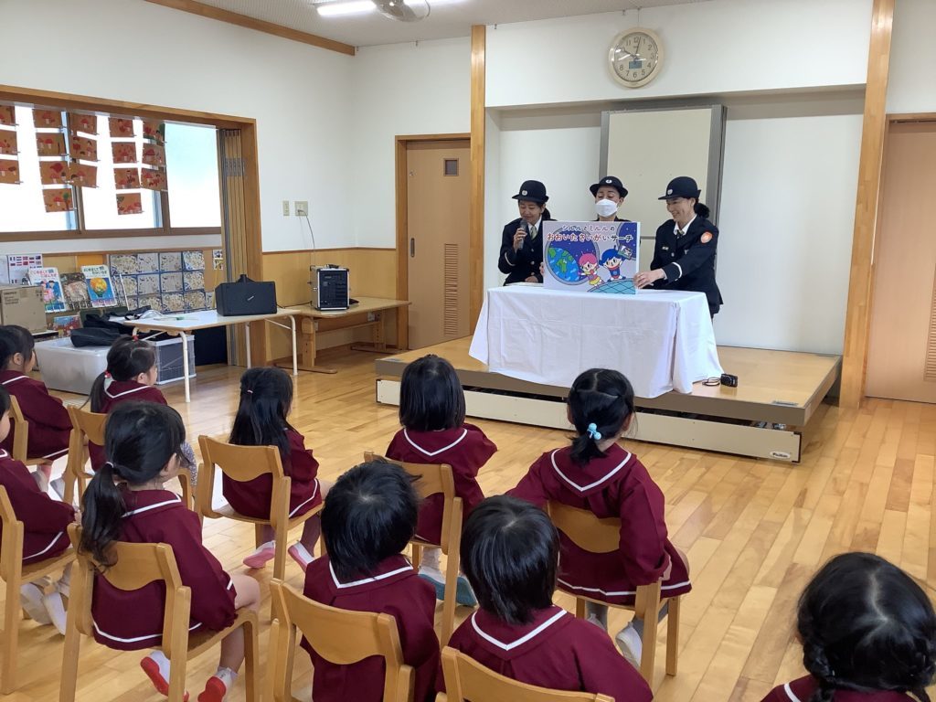 女性消防団の方に来ていただき、災害時のお話をして頂きました。地震、津波、大雪の時にはどこに避難したらよいか、子ども達にもできる対応の仕方など紙芝居を通して教えてくださり、また簡単なクイズ形式にして楽しくお話してくれたので話に聞き入っていました。その他にも避難する時のお約束「お・は・し・も・ち」押さない・走らない・しゃべらない・戻らない・近づかない、を教えて下さいました。