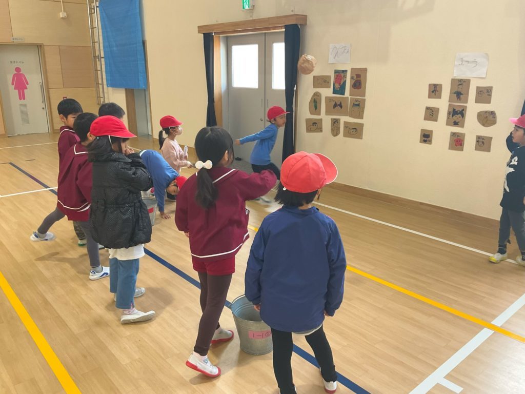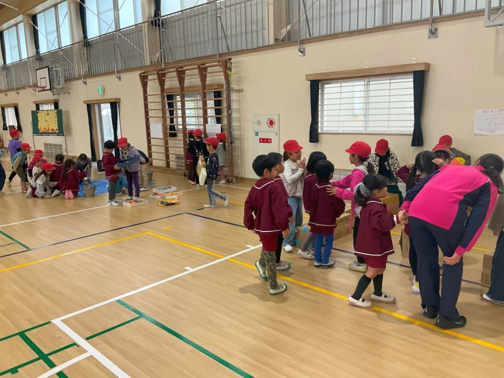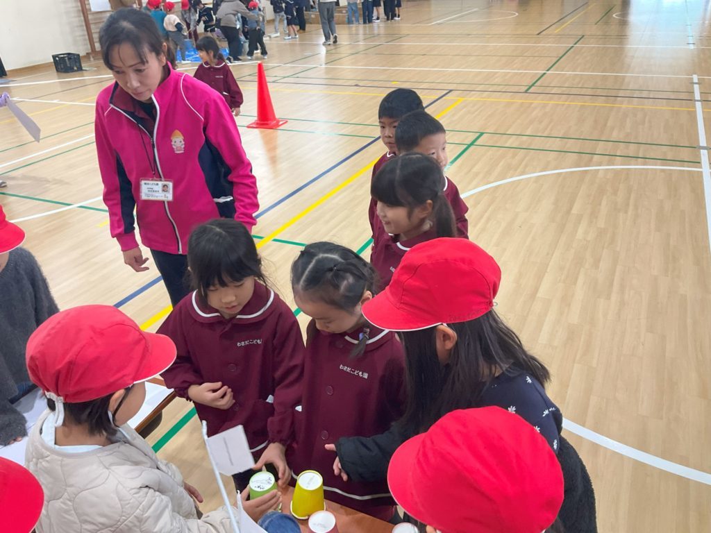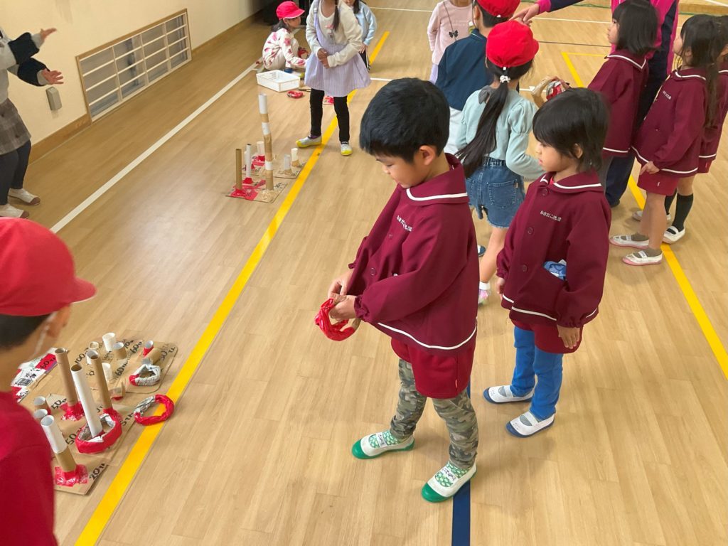 早速グループに分かれ、小学生のお兄さん・お姉さんが作った手作りオモチャ(的あて・コマ・輪投げ・ワ二ワ二パニック・ウサギリレー・迷路・魚釣り)などで遊びました。優しく遊び方を説明してくれたり、その子に合わせてルールを変更してくれたりと安心して楽しむ事が出来ていました。ゲームコーナーを回りながら卒園児さんの姿もあり成長した姿が見られ嬉しく思いました。