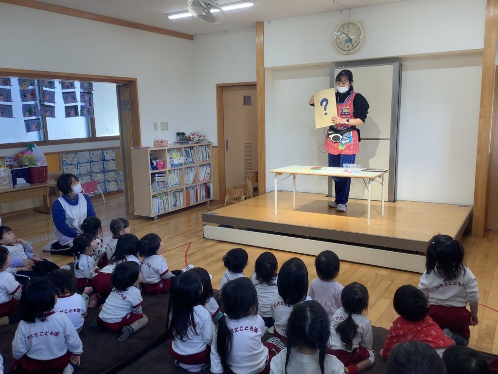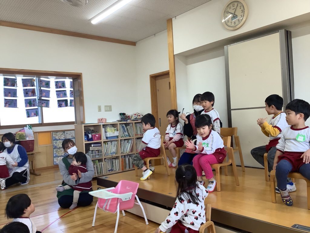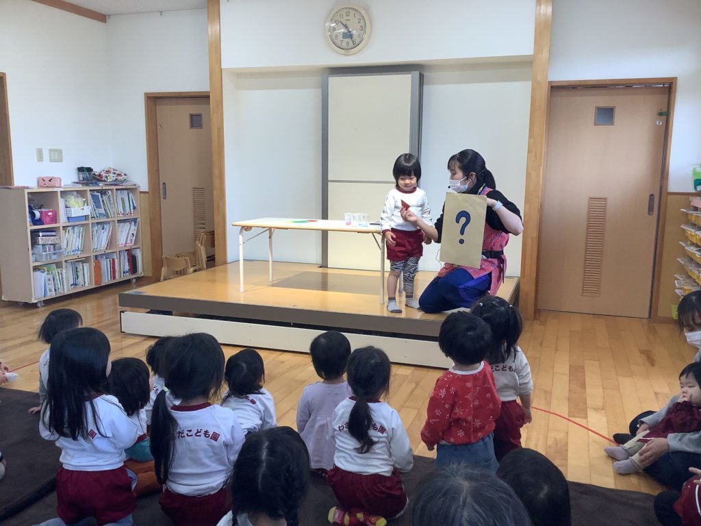 今回の出し物はマジックショー!!コップに入っているビーズが逆さまにしても落ちなかったり、画用紙が果物に変身したり最後は大きな誕生日ケーキが出来上がったりと興味津々でマジックを見ていました。マジシャンの保育教諭と「チチンプイのプイ!」と掛け声をかけるところが、次は何が出てくるのかなという期待のまなざしを浮かべる子ども達の姿が可愛かったです。