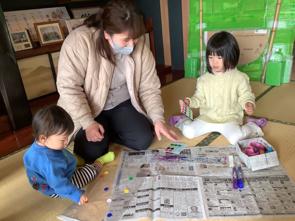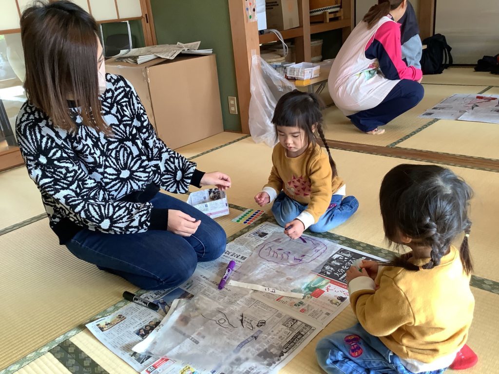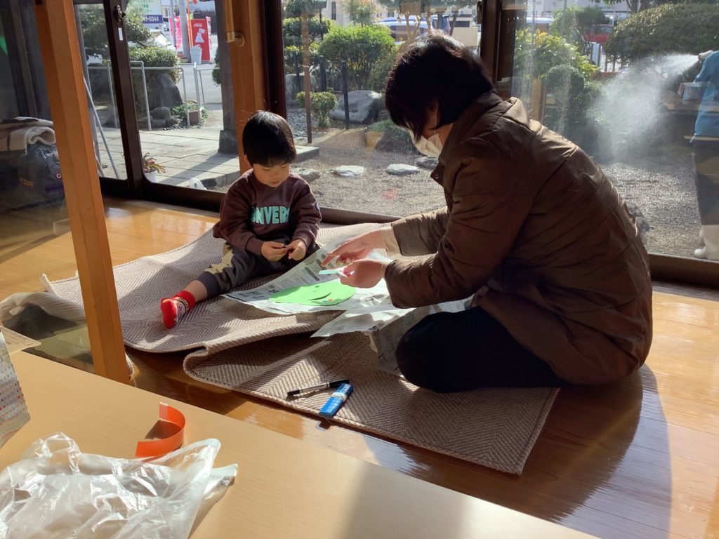 福笑いの後は凧作り!作りたい凧をお家の人と選び凧作り開始!