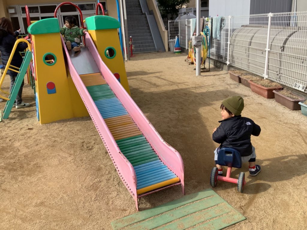 凧あげの後は三輪車や滑り台、砂場など好きな場所で親子で遊びました。