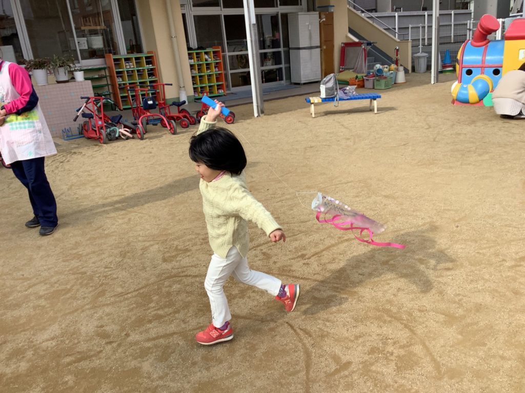 完成した凧を園庭に持って行って凧あげをしました。風がほとんどなく子ども達は園庭を元気いっぱい走り回り凧あげを楽しみました。