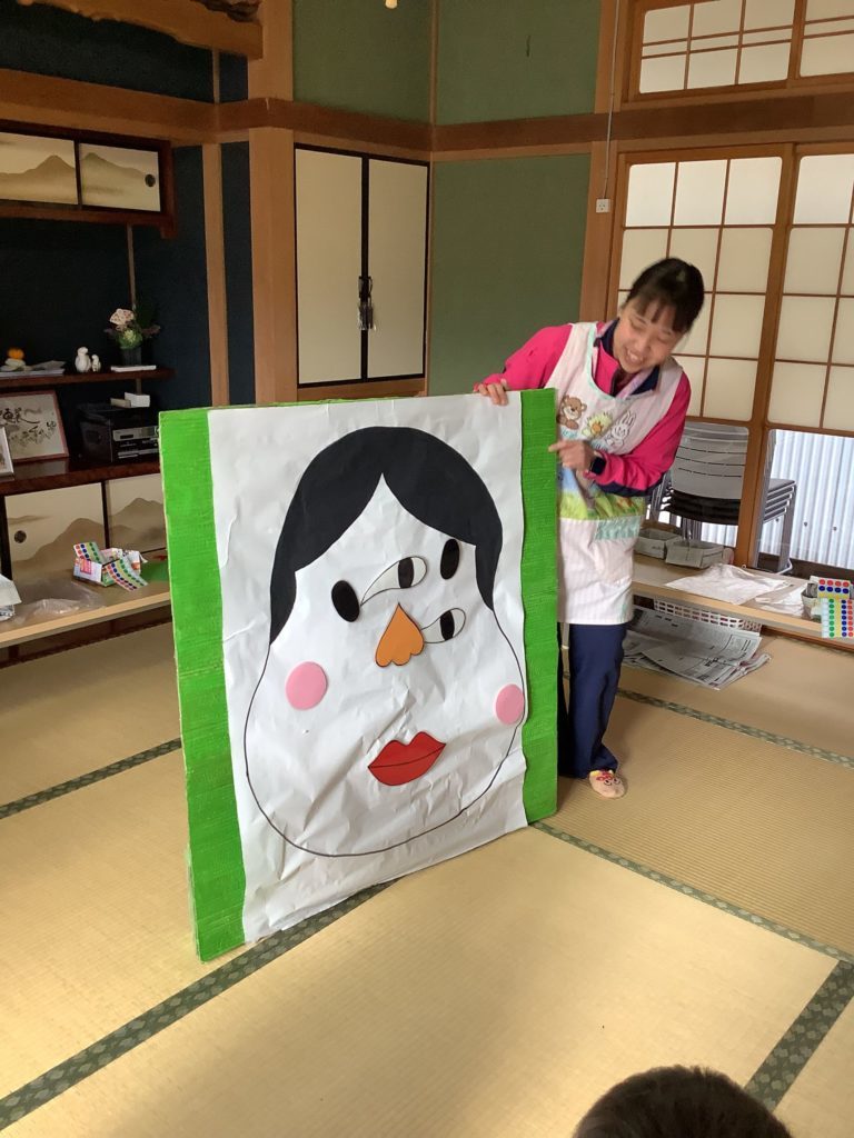今日はお正月遊びを親子で楽しもう♪をテーマに「からだカルタ」の体操を親子でしたり、福笑いを参加しているお友だちと協力して貼ったり、凧を製作し凧あげをしました。福笑いでは、始めに子ども達と顔のパーツの場所を一緒に確認しました。「眉毛」「口」「鼻」と自分の顔をおさえながら元気に答えてくれ、順番に顔のパーツを貼り面白いお福さんの顔が出来上がりました。今年一年笑顔のたえない楽しい年になりますように。
