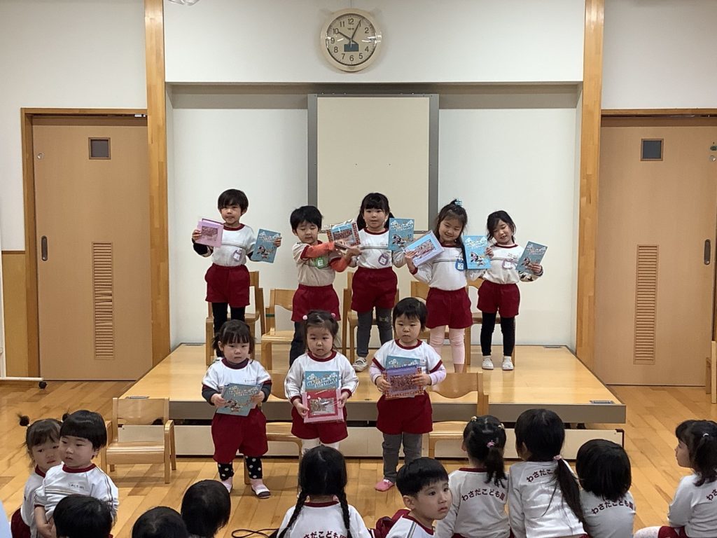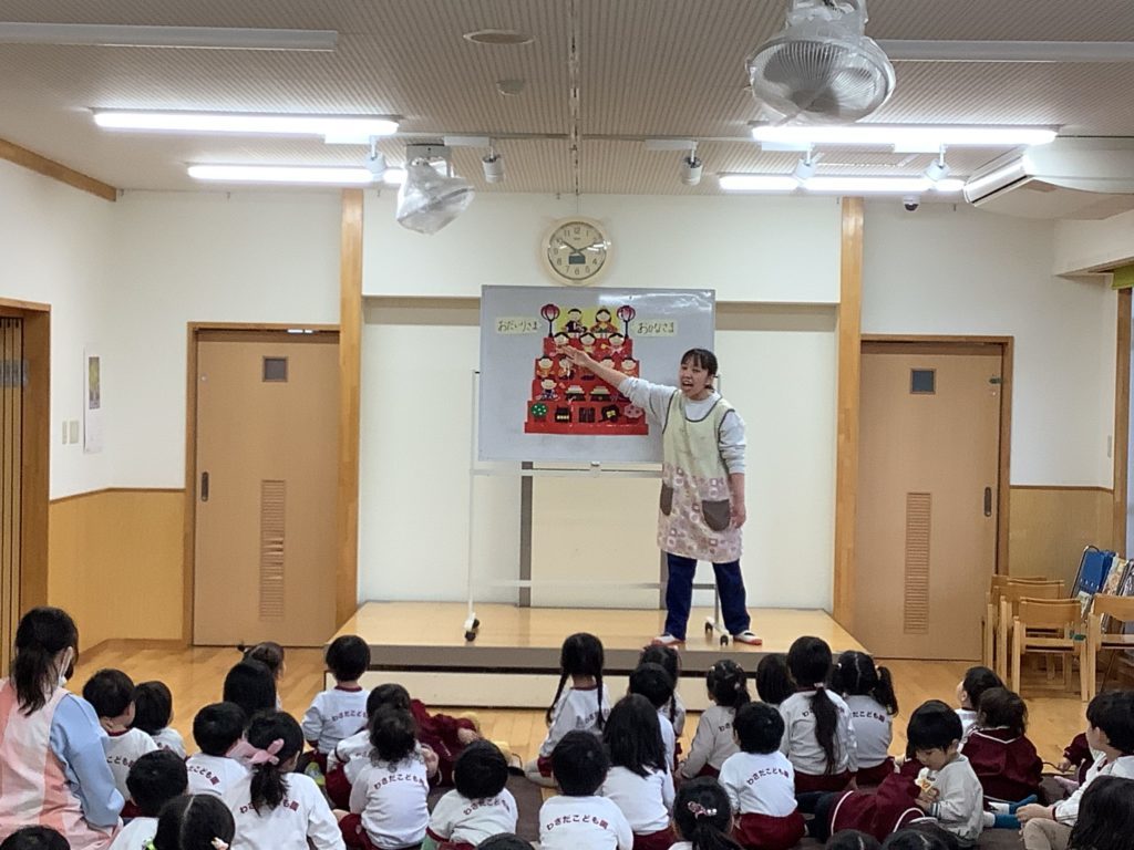 保育教諭からの出し物は、ひな祭りのボードシアターでした。ひな祭りの歌を元気よく歌いながら、人形が並んでいき「おひなさま!」「おだいりさま!」と言い、嬉しそうに並んでいくのを歌いながら見ていました。