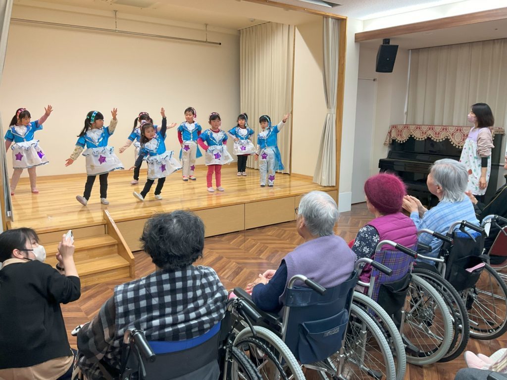 交流会ではおじいさん・おばあさんに発表会でしたダンスやリズム遊び・歌などを披露し、最後は「お寺の和尚さん」「一本橋こちょこちょ」などをして触れ合いました。始めの方は緊張で顔がこわばっていた子ども達も、おじいさん・おばあさんの温かい拍手や手拍子で場にも慣れ、途中から楽しそうにダンスを踊ったり歌ったりすることができていました。