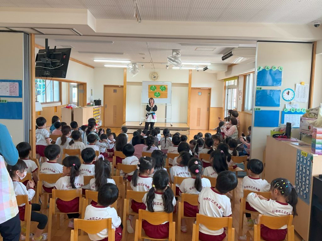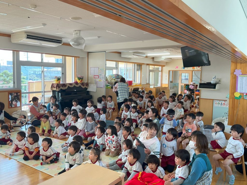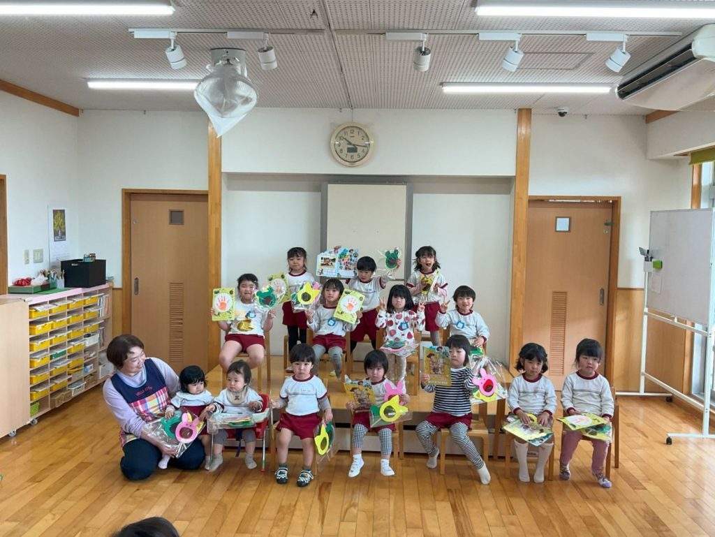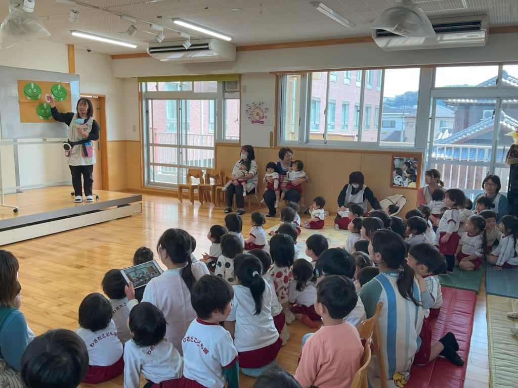 保育教諭からの出し物は、ボードシアター「キャベツの中から」でした。ピアノに合わせて皆で「きゃべつーの なかかーら♪」と歌い元気な歌声が園舎に響いていました。シアター中、可愛い虫が次々に出てくると「てんとうむし」「ちょうちょ」など嬉しそうに指をさし、虫の名前を元気よく答えていました。