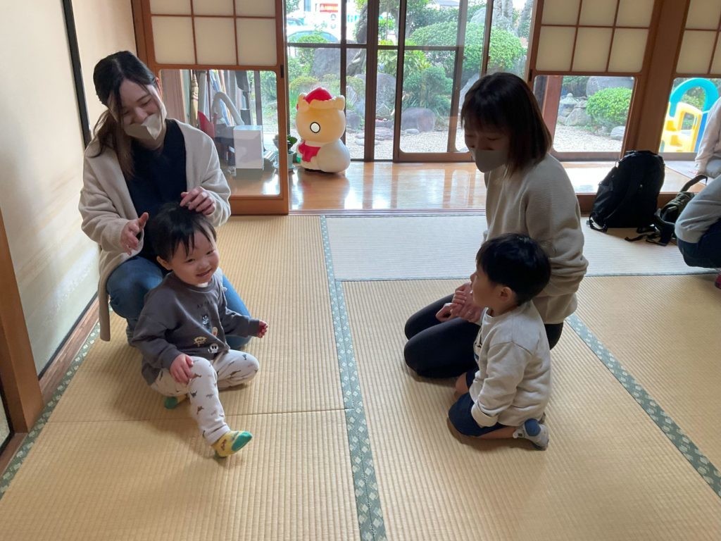 最後は♪お友だちとお散歩♪の曲に合わせて、座布団取りゲームをしました。ピアノの音をしっかり覚えていて、歩いたり・座ったりすることができていました。