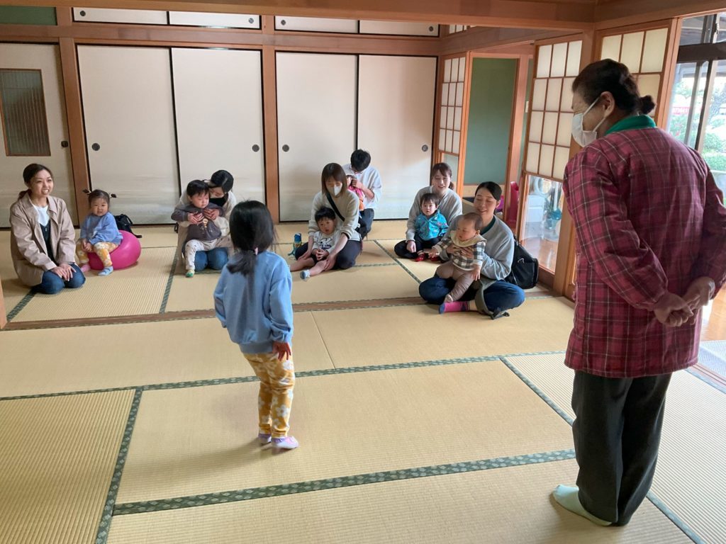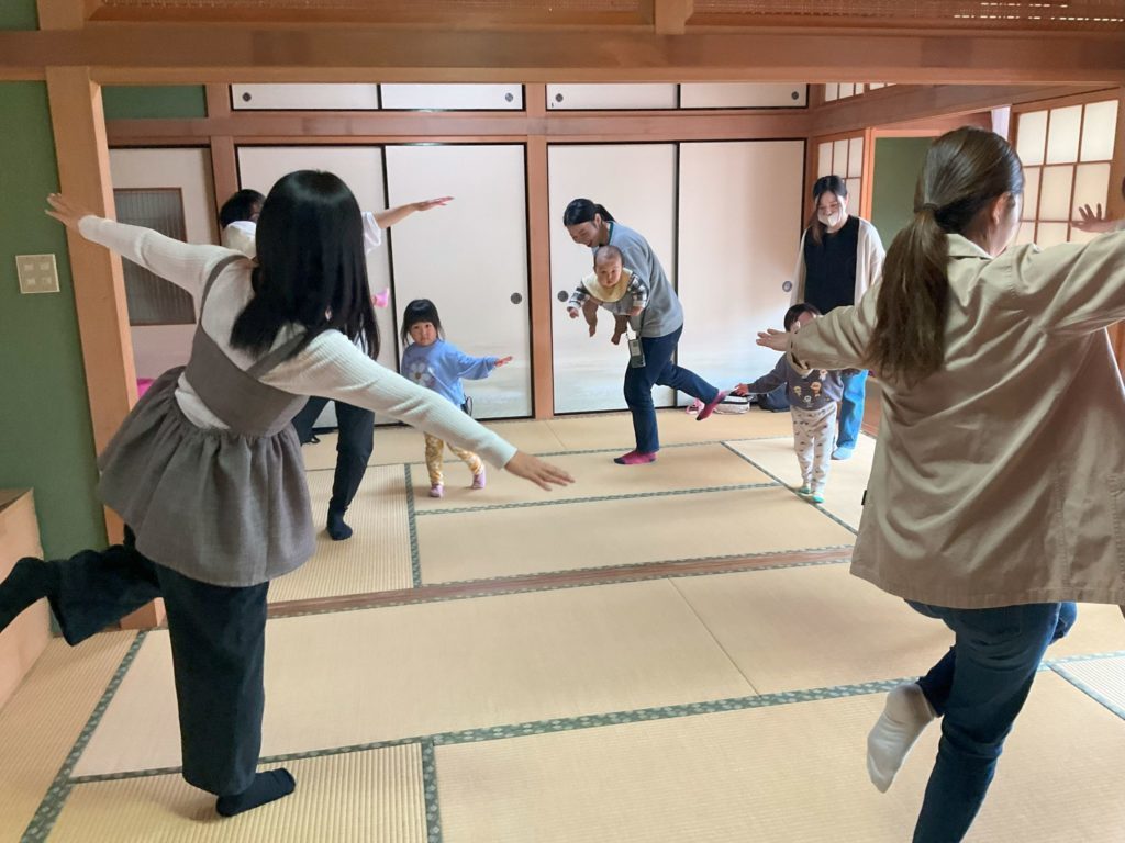 ♪「トンボのメガネ」 両手を大きく広げ、元気よく部屋の中を親子で飛び回りました。