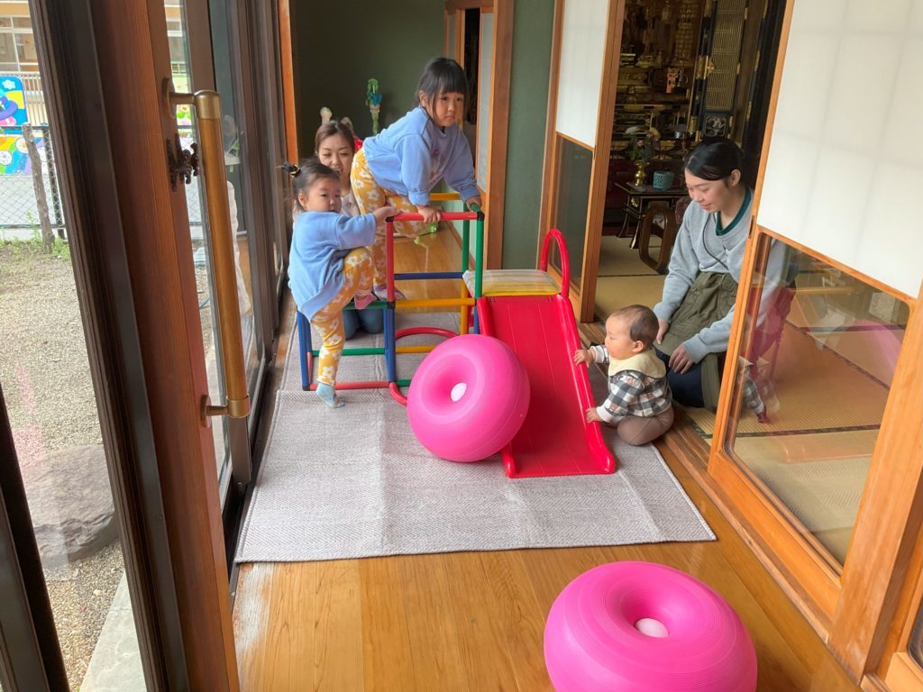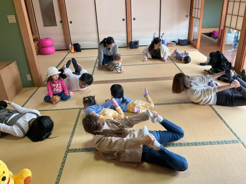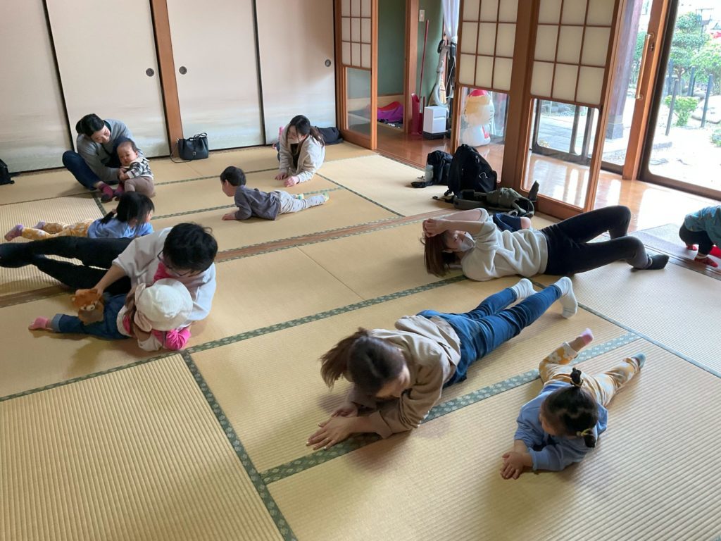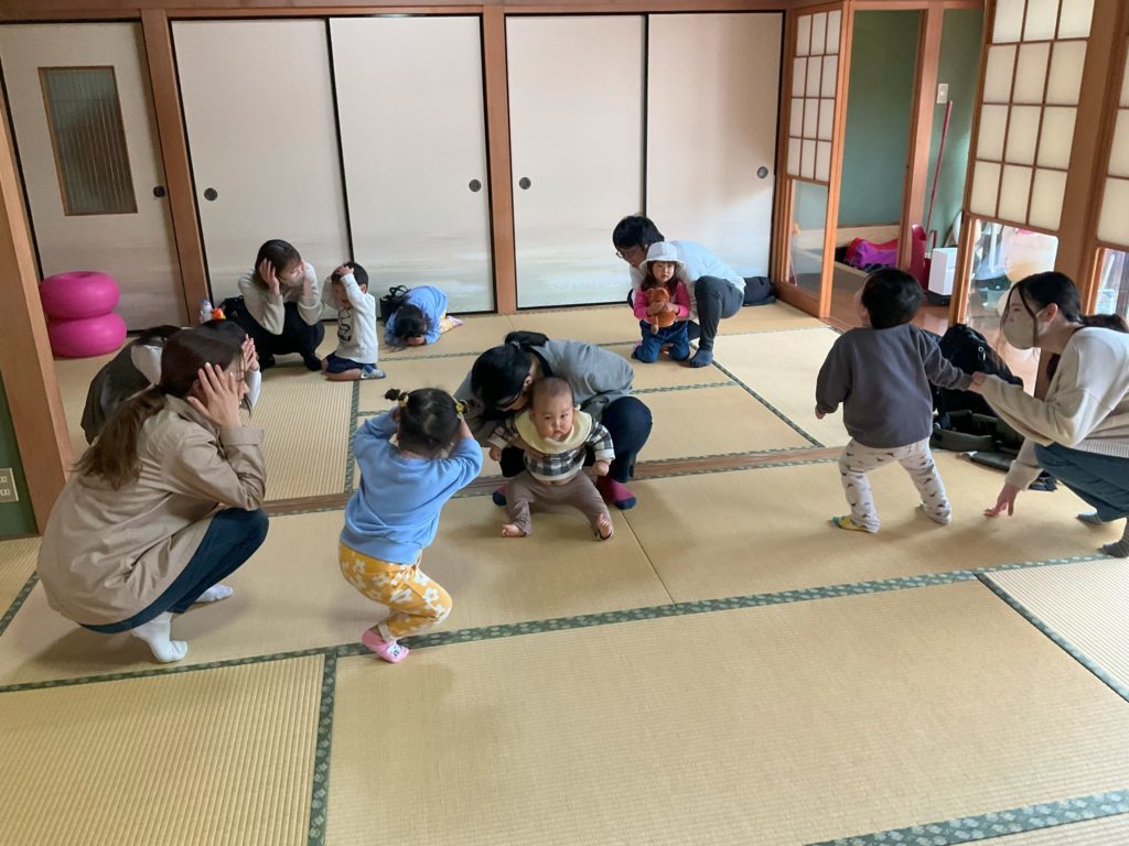 そのあとピアノの音に合わせて親子で部屋の中をお散歩しながら参加者同士挨拶をしたり、自己紹介をしたりして交流をしました。