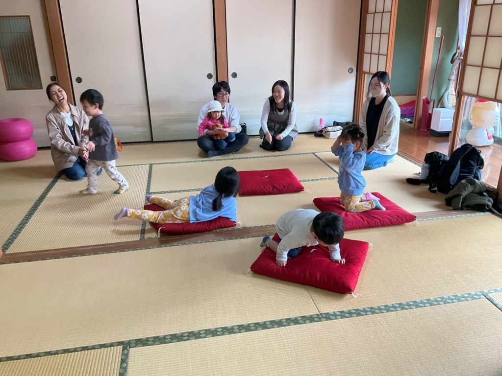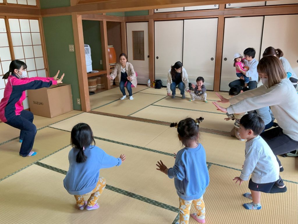 また子ども達も知っている曲、「トンボのメガネ」や「かめさん」など流れるといっしょに歌ってくれ、お家の方も一緒に思いきり体を動かしてくれ子ども達もお家の方とたくさん触れ合え楽しそうでした。