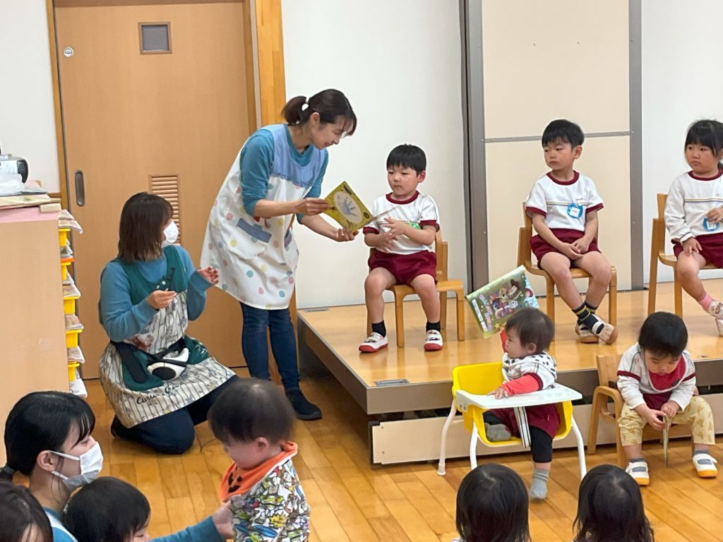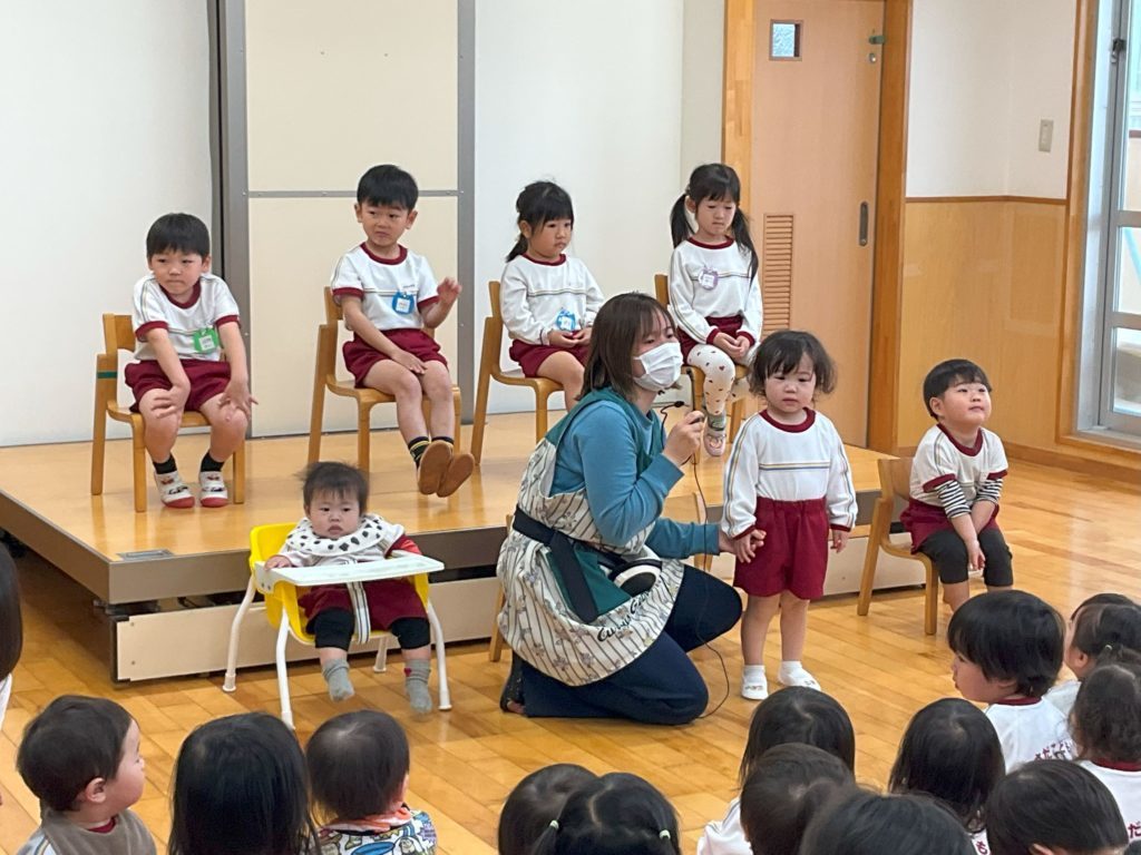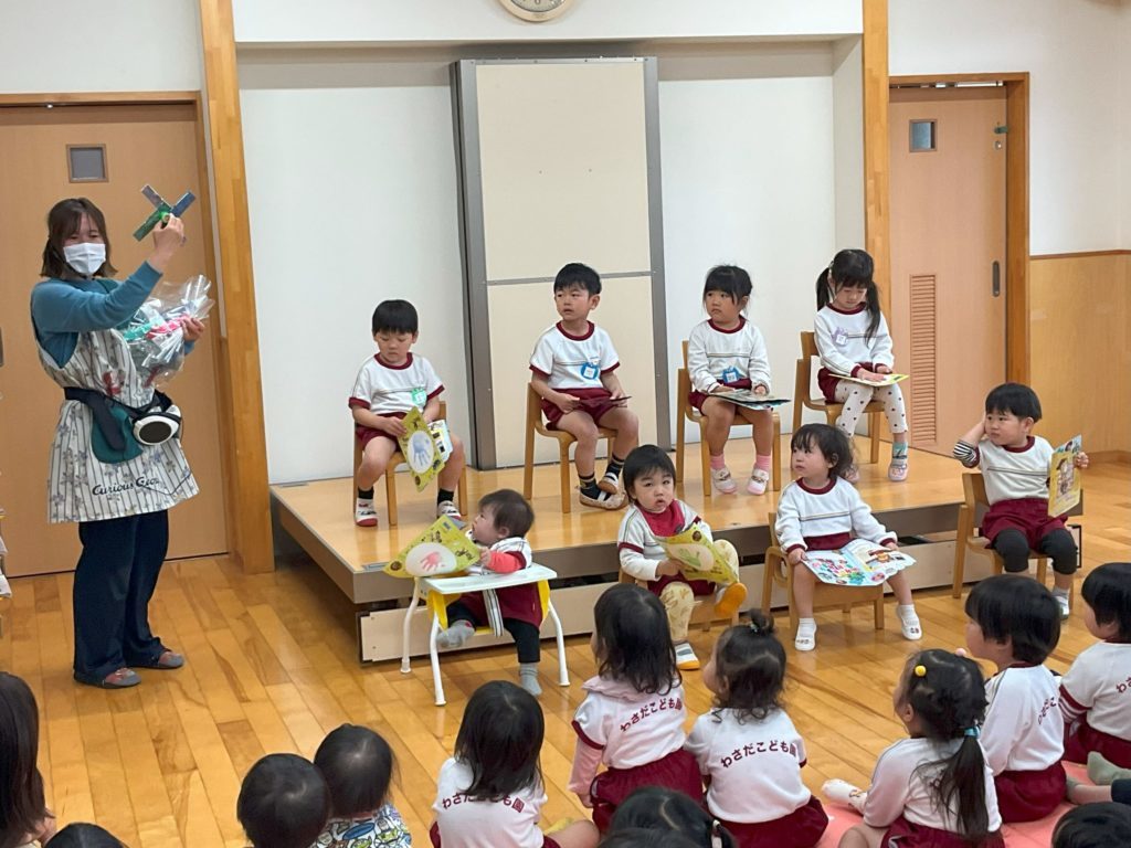 鯉のぼりのお話では、前を見てしっかりお話を聞いていた子ども達。鯉が頑張って滝を登っていく様子をみて園舎中に響くほど元気な声で「がんばれー!」と何度も鯉を応援していました。クイズでは手をしっかり挙げて答える事が出来ていましたよ。
