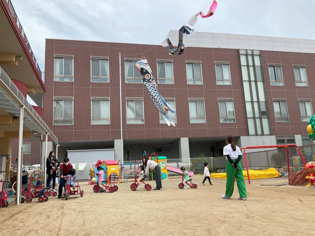 製作の最後には一人ひとりが作った鯉のぼりを大きい鯉のぼりに貼って、世界に一つだけのひまわり学級の鯉のぼりが出来上がりました。皆で大きい鯉のぼりを背に写真を撮りました。