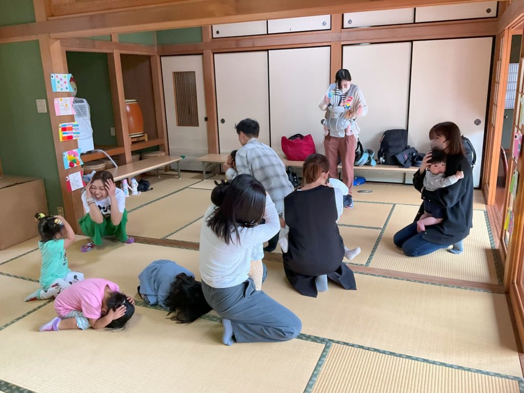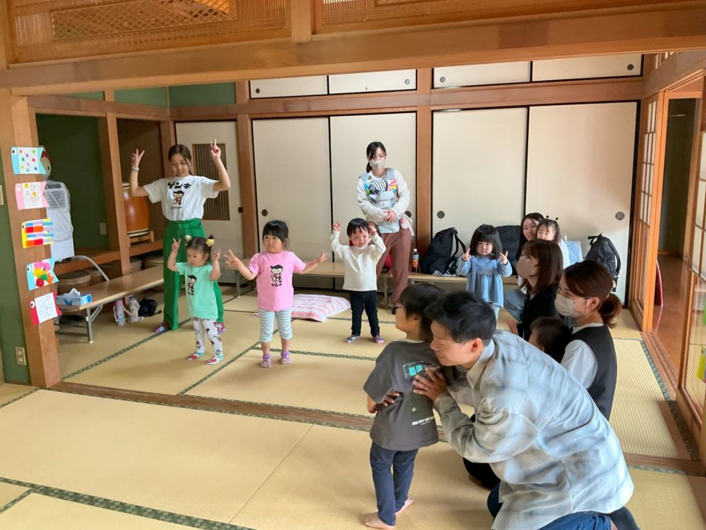 リトミックは前回もしており、前回参加してくれていたお友だちは動作を覚えていてピアノの音に合わせてジャンプしたり、しゃがんだりすることが出来ていました。初めて参加してくれたお友だちに在園児さんが声を掛けてくれ、すぐに仲良くなり一緒に楽しく体を動かす姿も見られました。