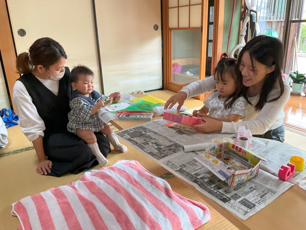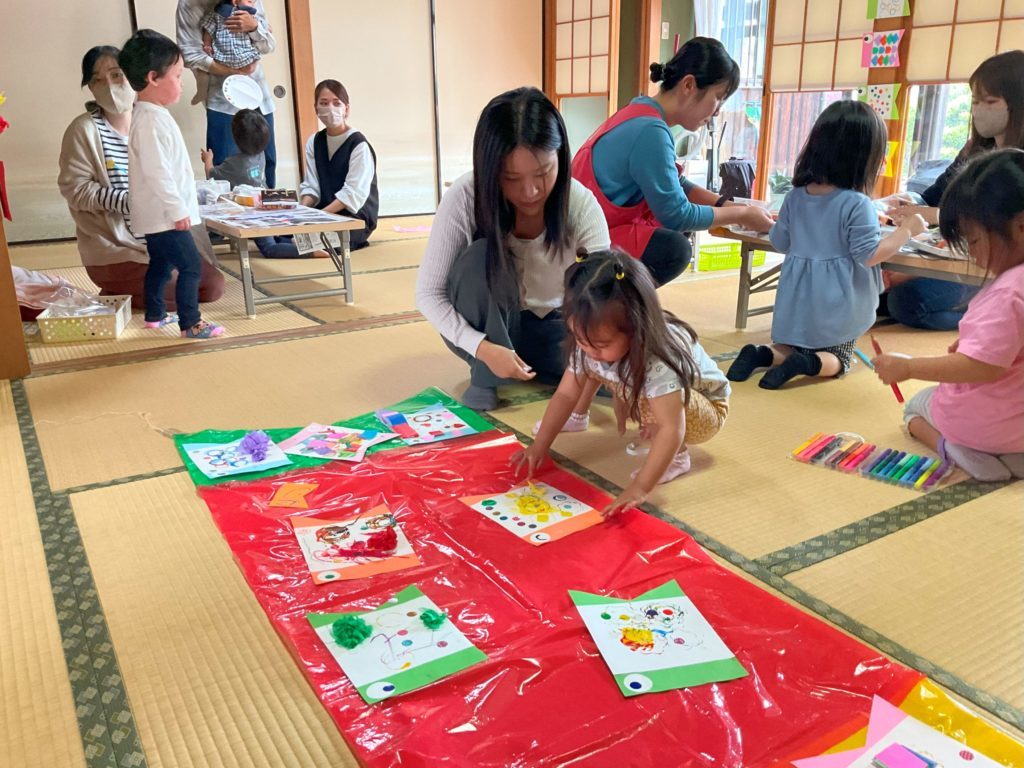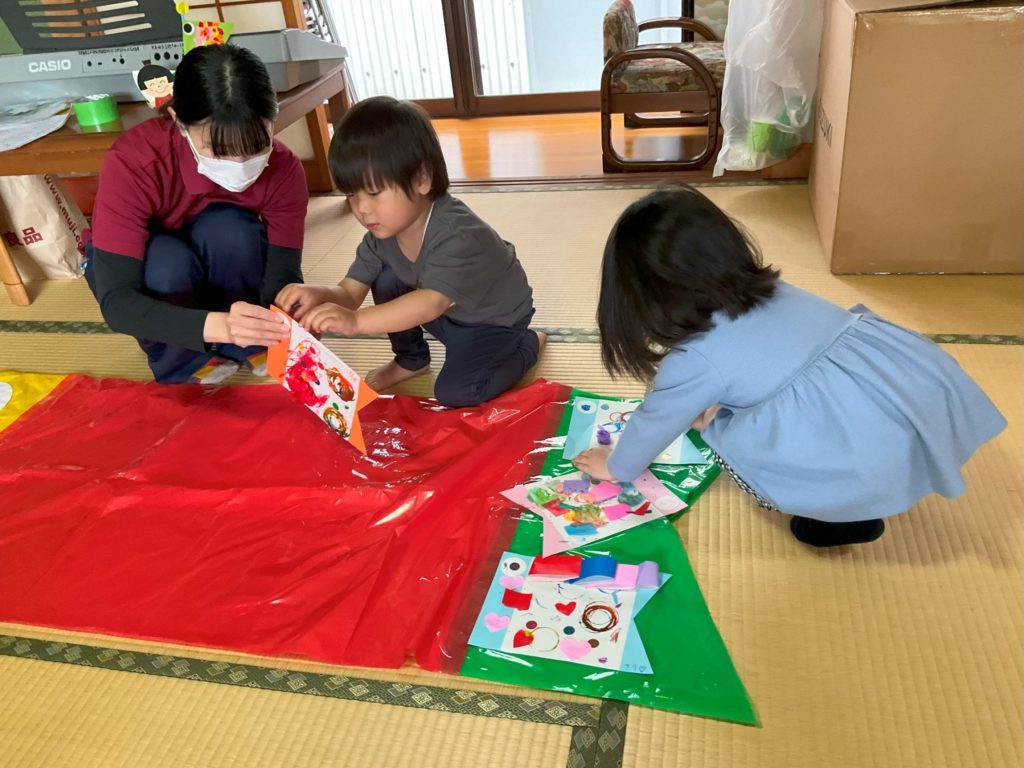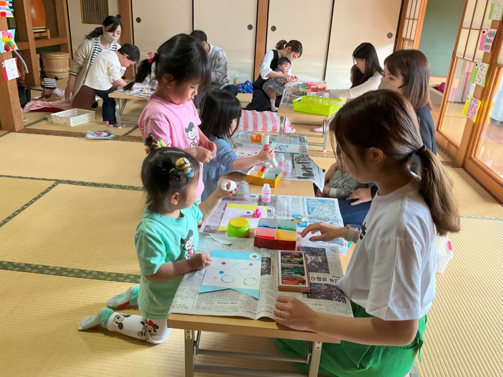 今回は「親子でこいのぼり製作をしよう」でした。鯉の形の画用紙に、ラップの芯やヤクルトの容器を使ってスタンプしたり、シールやお花紙などを使って鯉のぼりに飾り付けをしました。参加者同士楽しく会話を楽しみ、笑顔もたくさん見られあたたかい雰囲気の中で製作活動ができたと思います。