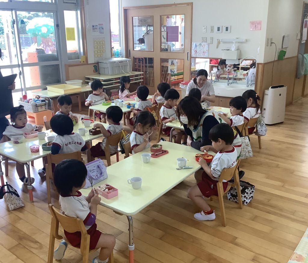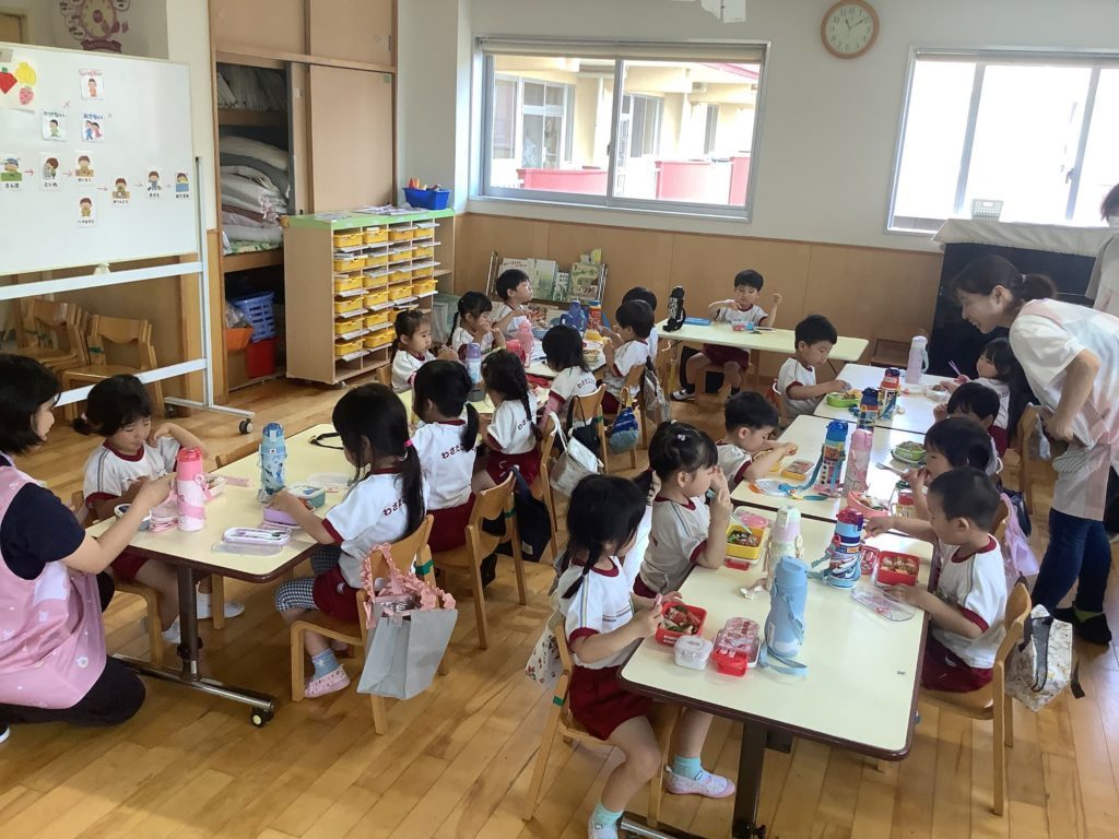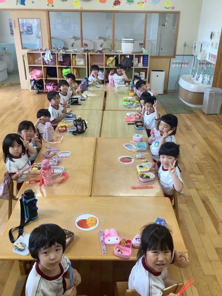 園庭で食べたいというクラスもありましたが、昨日の雨で園庭が水浸し・・・園庭で食べるのは諦めて、今日はお部屋で食べました。