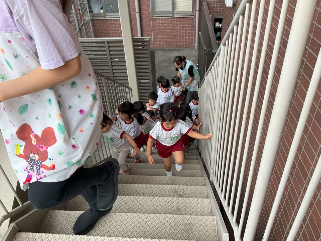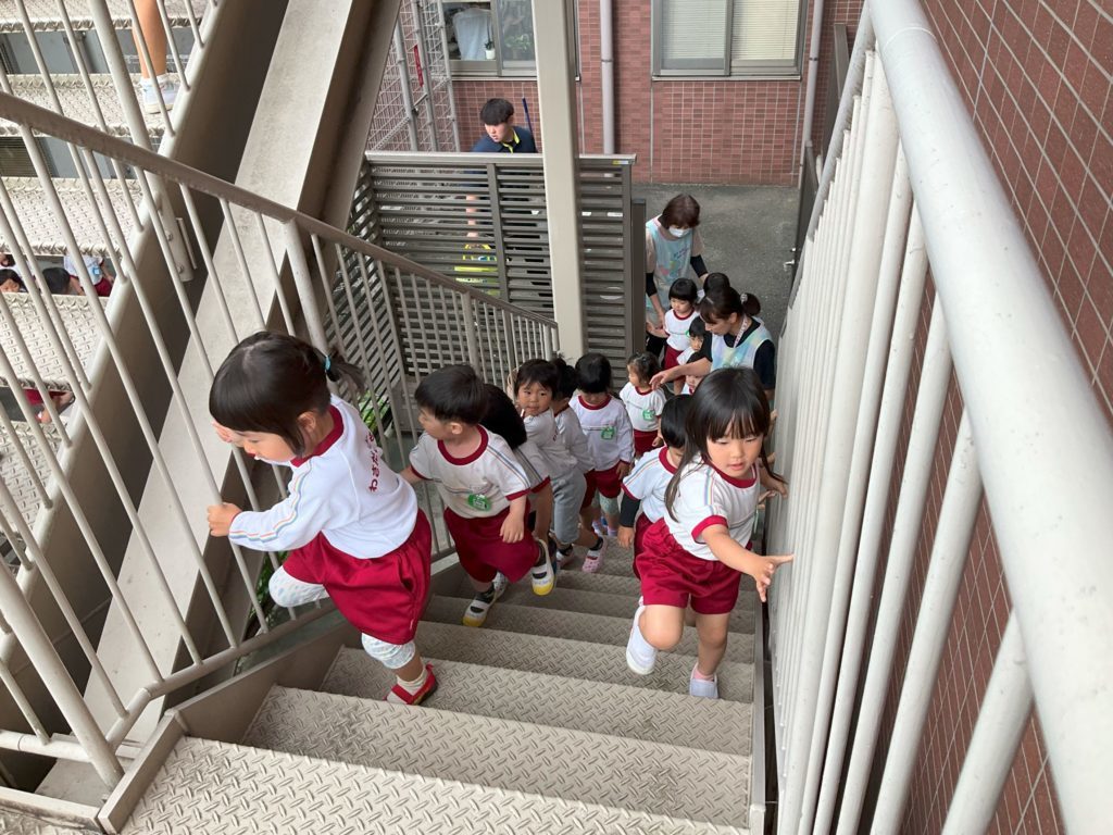 今回は通常の避難訓練と合わせて、3.4.5歳児さんは洪水を想定しての避難訓練も行い避難経路の確認を行いました。