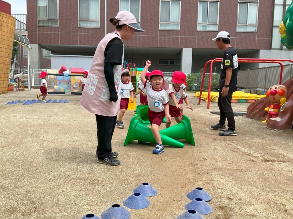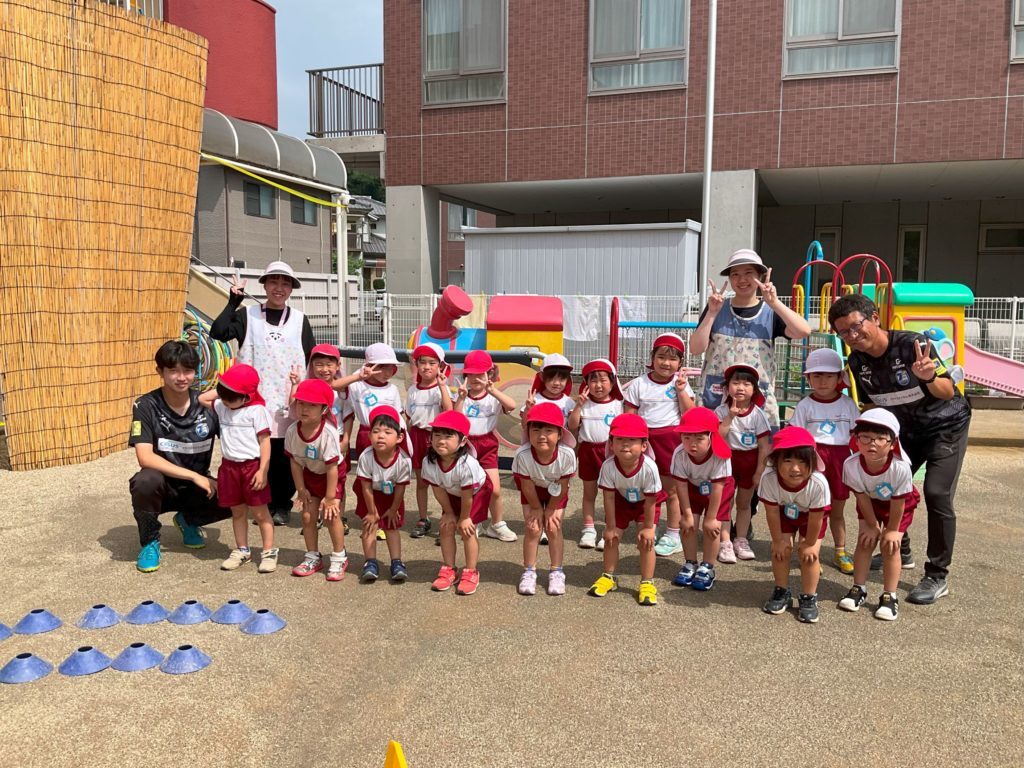 体の動かし方・ボールに触れ、持ったり・蹴ったり、簡単なゲームなどを通してサッカーに触れコーチに褒められたりしながら楽しそうに嬉しそうに取り組んでいました。子ども達の表情からも、思いきり体を動かして遊ぶ楽しさが味わえたのが伝わってきました。